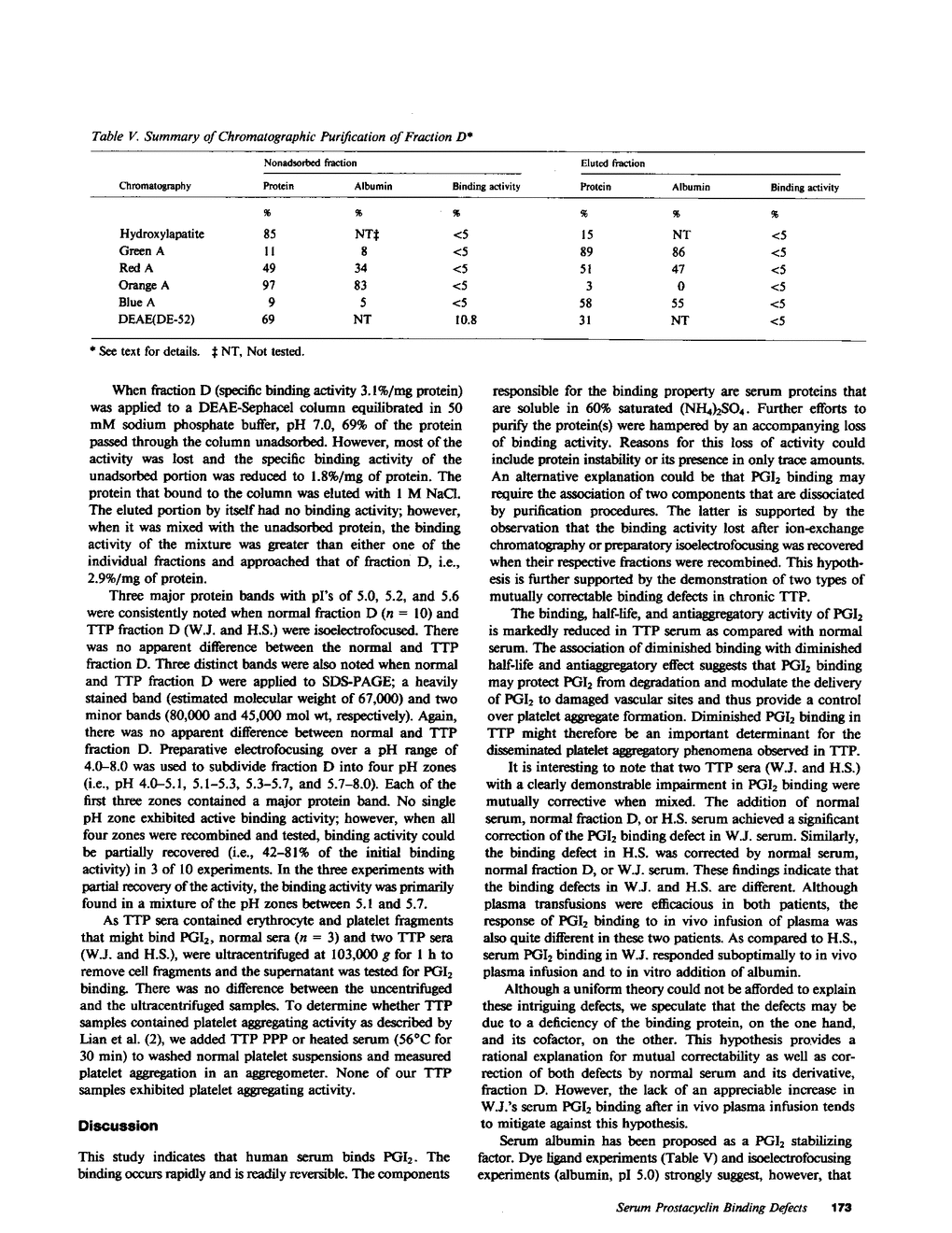 To understand the pathophysiologic significance of abnormal serum prostacyclin (PGI2) binding activities in thrombotic thrombocytopenic purpura (TTP), we evaluated the PGI2 binding characteristics in three chronic TTP sera and 19 normal sera. PGI2 binding by serum was rapid and reversible. The binding activity in TTP sera (22.1 +/- SD, 4.4%) was significantly lower than that of normal sera (42.2 +/- 6.2%). Moreover, the antiaggregating activity and 6-keto-prostaglandin F1 alpha (6KPGF1 alpha) content in the gel filtrates representing the binding peak was proportionally lower in a TTP serum than normal serum. Although normal and TTP sera bound [14C]arachidonate with similar activity, and neither bound [3H]6KPGF1 alpha, there was a difference in prostaglandin E1 (PGE1) binding. Binding of [3H]PGE1 was subnormal in two TTP sera (W.J. and T.G.) and normal in the third (H.S.). Normal serum corrected the binding defects of TTP serum. Interestingly, the mixture of two TTP sera (W.J. and H.S.) mutually corrected their PGI2 binding defects. In addition, although in vivo plasma transfusions improved the PGI2 binding activity of W.J. and H.S., there existed a striking difference in the nature of their response. These observations indicate that there is at least two types of PGI2 binding defects in TTP. Our data indicate that TTP is associated with diminished serum binding of PGI2. This defect may reduce the availability of PGI2 to damaged vascular sites and decrease an important modulator of platelet thrombus formation at times of severe vascular insult.