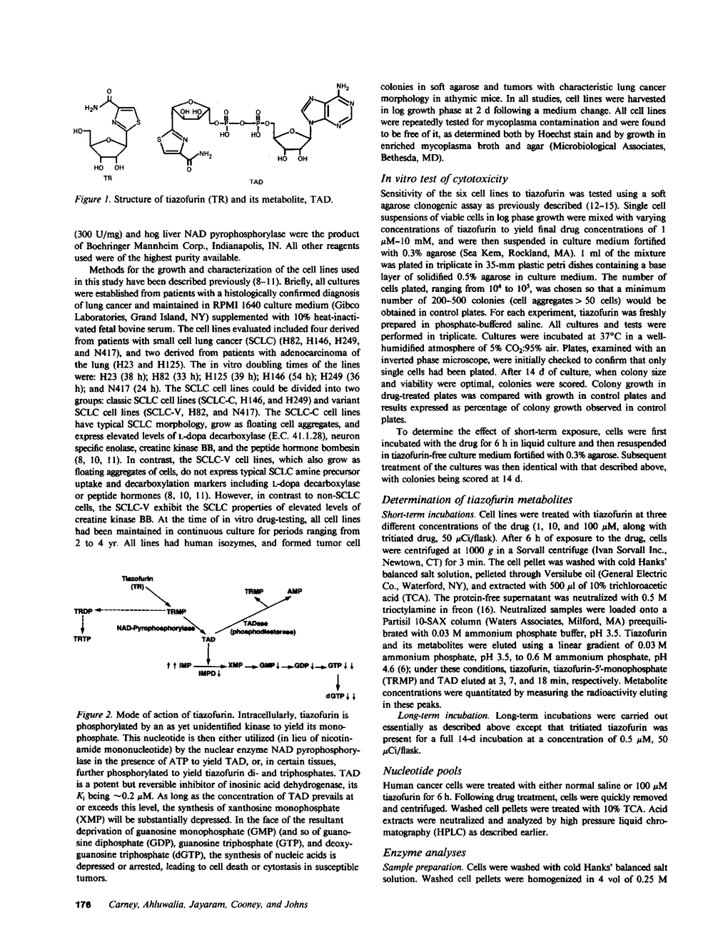 The antitumor activity of the antineoplastic agent, tiazofurin (2-beta-D-ribofuranosylthiazole-4-carboxamide), has previously been shown to require intracellular anabolism of the drug to a nicotinamide adenine dinucleotide (NAD) analog (2-beta-D-ribofuranosylthiazole-4-carboxamide adenine dinucleotide or "tiazofurin adenine dinucleotide"), which then acts as a potent inhibitor of the target enzyme inosine monophosphate (IMP) dehydrogenase. Inhibition of the latter enzyme in turn brings about a profound depletion of intracellular guanosine nucleotides essential for tumor cell growth and replication. In the present study, the cytotoxicity and metabolism of tiazofurin have been examined in six human lung cancer cell lines. At the pharmacologically attainable drug concentration of 100 microM, colony survival was less than 1.5% in three cell lines ("sensitive"), while survival in the remaining three was greater than 50% ("resistant"). The metabolism of tritiated tiazofurin was examined at concentrations ranging from 0.5 to 100 microM following both brief (6 h) and protracted (14 d) exposures. The sensitive lines accumulated concentrations of tiazofurin adenine dinucleotide that were approximately 10 times those achieved by the resistant lines at both time points. We also observed tendencies for the sensitive cell lines to exhibit: (a) higher specific activities of NAD pyrophosphorylase, the enzyme required for the synthesis of tiazofurin adenine dinucleotide, (b) significantly lower levels of a phosphodiesterase which degrades the latter dinucleotide, (c) greater inhibition of the target enzyme IMP dehydrogenase, and (d) greater depressions of guanosine nucleotide pools after drug treatment. By contrast, the basal levels of IMP dehydrogenase and purine nucleotides in these six lines did not correlate in any obvious way with their responsiveness or resistance. The accumulation and monophosphorylation of parent drug were also not prognostic variables. These studies thus suggest that the extent of accumulation of tiazofurin adenine dinucleotide, as regulated by its synthetic and degradative enzyme activities, is the single most predictive determinant of the responsiveness of cultured human lung tumor cells to tiazofurin.