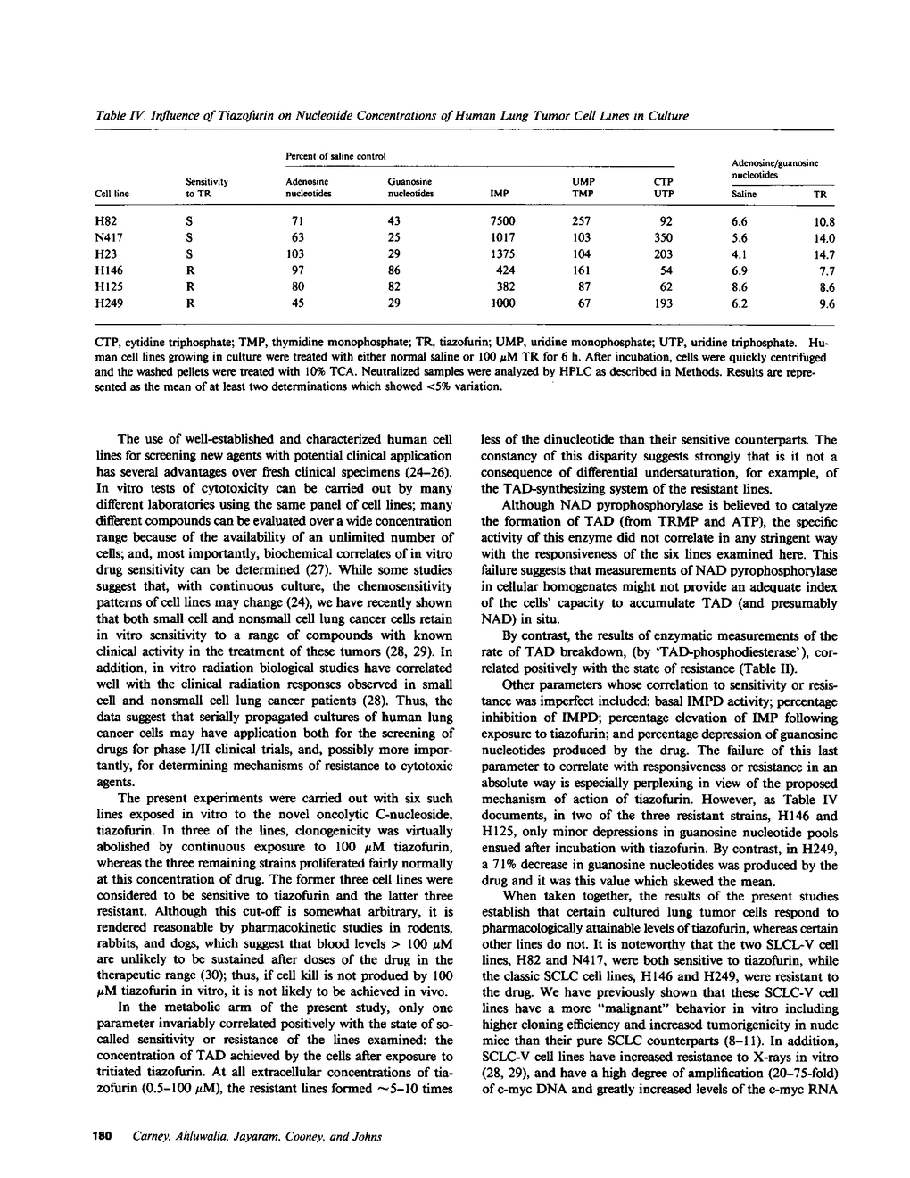The antitumor activity of the antineoplastic agent, tiazofurin (2-beta-D-ribofuranosylthiazole-4-carboxamide), has previously been shown to require intracellular anabolism of the drug to a nicotinamide adenine dinucleotide (NAD) analog (2-beta-D-ribofuranosylthiazole-4-carboxamide adenine dinucleotide or "tiazofurin adenine dinucleotide"), which then acts as a potent inhibitor of the target enzyme inosine monophosphate (IMP) dehydrogenase. Inhibition of the latter enzyme in turn brings about a profound depletion of intracellular guanosine nucleotides essential for tumor cell growth and replication. In the present study, the cytotoxicity and metabolism of tiazofurin have been examined in six human lung cancer cell lines. At the pharmacologically attainable drug concentration of 100 microM, colony survival was less than 1.5% in three cell lines ("sensitive"), while survival in the remaining three was greater than 50% ("resistant"). The metabolism of tritiated tiazofurin was examined at concentrations ranging from 0.5 to 100 microM following both brief (6 h) and protracted (14 d) exposures. The sensitive lines accumulated concentrations of tiazofurin adenine dinucleotide that were approximately 10 times those achieved by the resistant lines at both time points. We also observed tendencies for the sensitive cell lines to exhibit: (a) higher specific activities of NAD pyrophosphorylase, the enzyme required for the synthesis of tiazofurin adenine dinucleotide, (b) significantly lower levels of a phosphodiesterase which degrades the latter dinucleotide, (c) greater inhibition of the target enzyme IMP dehydrogenase, and (d) greater depressions of guanosine nucleotide pools after drug treatment. By contrast, the basal levels of IMP dehydrogenase and purine nucleotides in these six lines did not correlate in any obvious way with their responsiveness or resistance. The accumulation and monophosphorylation of parent drug were also not prognostic variables. These studies thus suggest that the extent of accumulation of tiazofurin adenine dinucleotide, as regulated by its synthetic and degradative enzyme activities, is the single most predictive determinant of the responsiveness of cultured human lung tumor cells to tiazofurin.