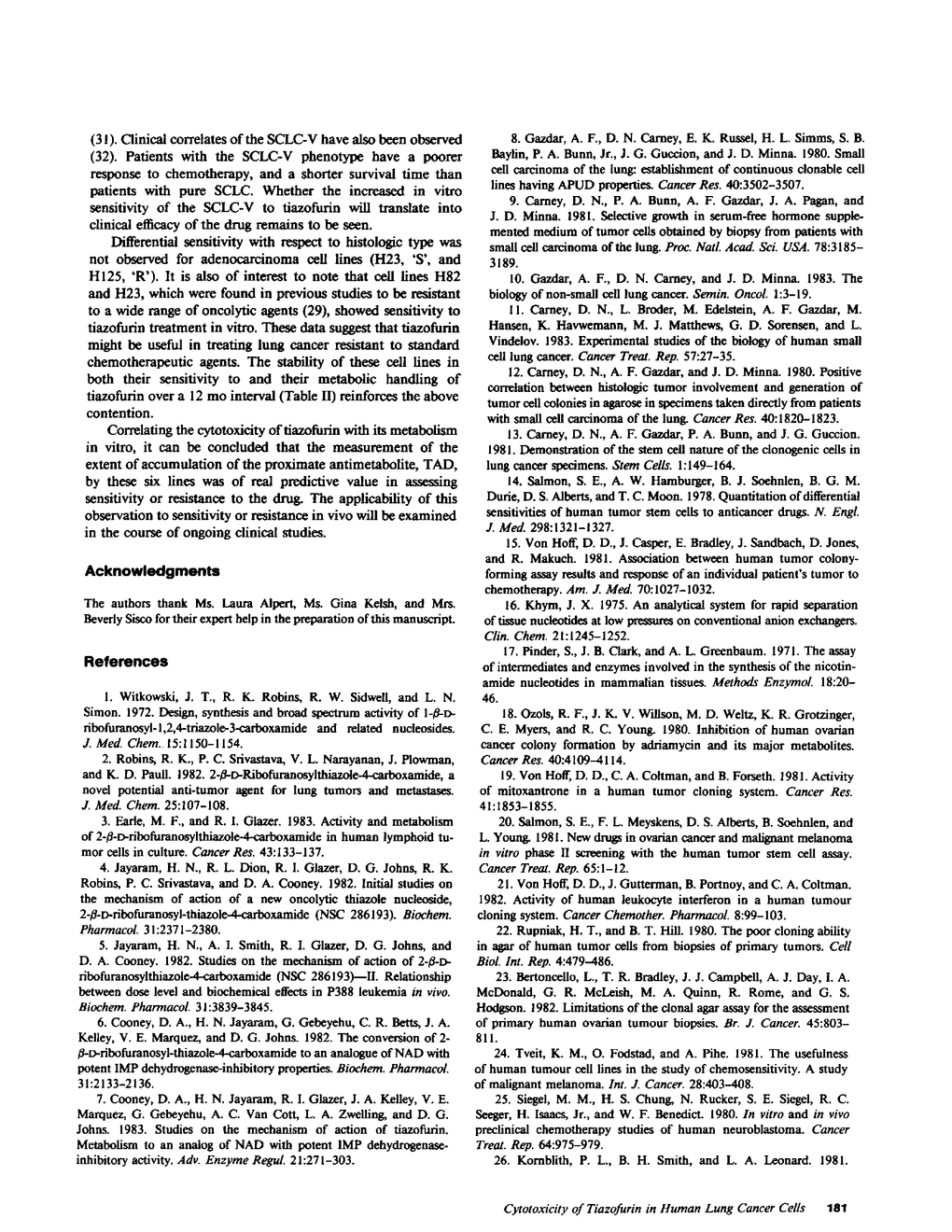 The antitumor activity of the antineoplastic agent, tiazofurin (2-beta-D-ribofuranosylthiazole-4-carboxamide), has previously been shown to require intracellular anabolism of the drug to a nicotinamide adenine dinucleotide (NAD) analog (2-beta-D-ribofuranosylthiazole-4-carboxamide adenine dinucleotide or "tiazofurin adenine dinucleotide"), which then acts as a potent inhibitor of the target enzyme inosine monophosphate (IMP) dehydrogenase. Inhibition of the latter enzyme in turn brings about a profound depletion of intracellular guanosine nucleotides essential for tumor cell growth and replication. In the present study, the cytotoxicity and metabolism of tiazofurin have been examined in six human lung cancer cell lines. At the pharmacologically attainable drug concentration of 100 microM, colony survival was less than 1.5% in three cell lines ("sensitive"), while survival in the remaining three was greater than 50% ("resistant"). The metabolism of tritiated tiazofurin was examined at concentrations ranging from 0.5 to 100 microM following both brief (6 h) and protracted (14 d) exposures. The sensitive lines accumulated concentrations of tiazofurin adenine dinucleotide that were approximately 10 times those achieved by the resistant lines at both time points. We also observed tendencies for the sensitive cell lines to exhibit: (a) higher specific activities of NAD pyrophosphorylase, the enzyme required for the synthesis of tiazofurin adenine dinucleotide, (b) significantly lower levels of a phosphodiesterase which degrades the latter dinucleotide, (c) greater inhibition of the target enzyme IMP dehydrogenase, and (d) greater depressions of guanosine nucleotide pools after drug treatment. By contrast, the basal levels of IMP dehydrogenase and purine nucleotides in these six lines did not correlate in any obvious way with their responsiveness or resistance. The accumulation and monophosphorylation of parent drug were also not prognostic variables. These studies thus suggest that the extent of accumulation of tiazofurin adenine dinucleotide, as regulated by its synthetic and degradative enzyme activities, is the single most predictive determinant of the responsiveness of cultured human lung tumor cells to tiazofurin.