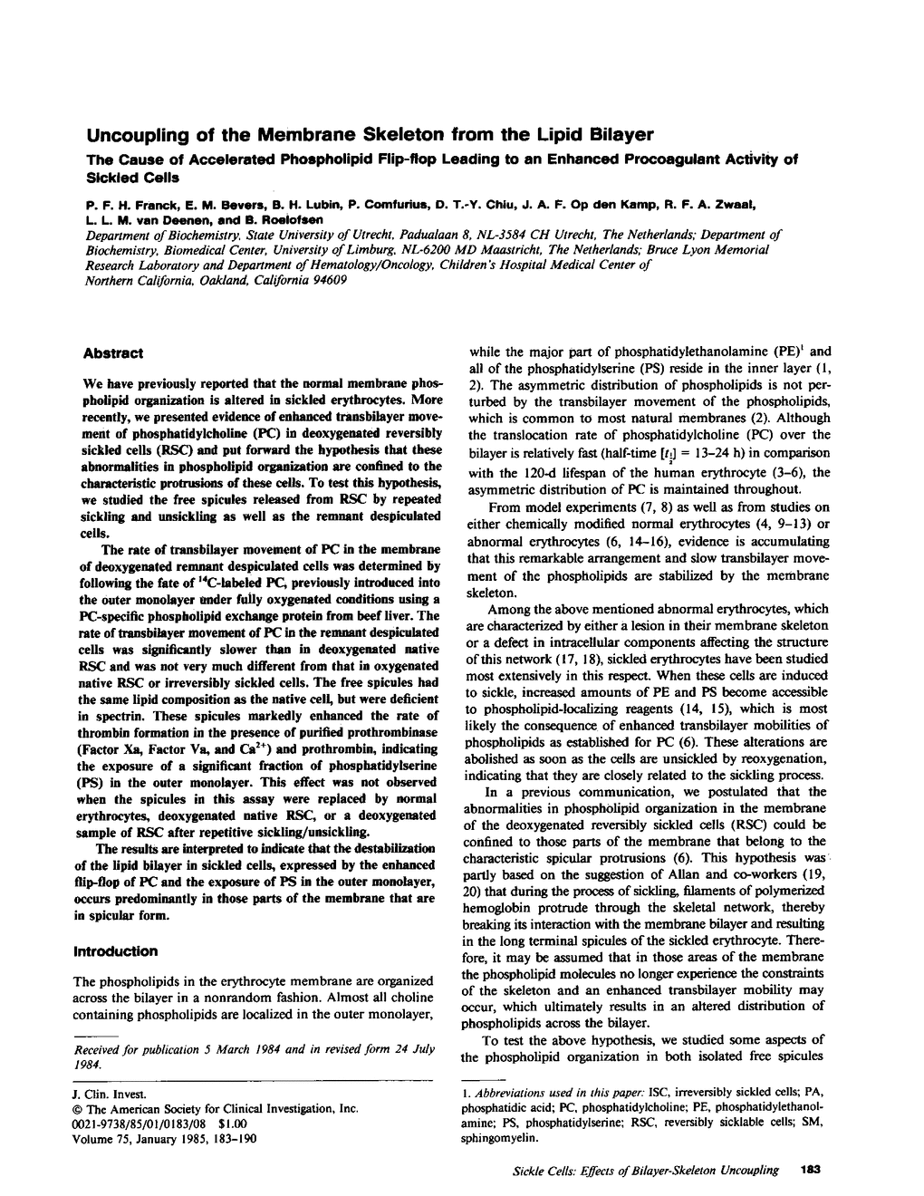 P F Franck, E M Bevers, B H Lubin, P Comfurius, D T Chiu, J A Op den Kamp, R F Zwaal, L L van Deenen, B Roelofsen