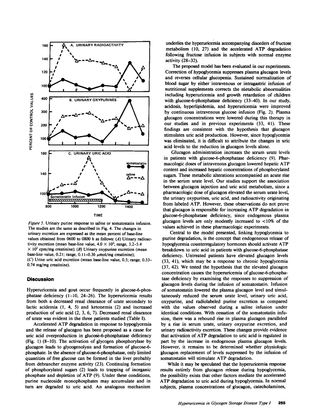 Studies were performed to determine whether hypoglycemia or the glucagon response to hypoglycemia increases uric acid production in glycogen storage disease type I (glucose-6-phosphatase deficiency). Three adults with this disease had hyperuricemia (serum urate, 11.3-12.4 mg/dl) and reduced renal clearance of urate (renal urate clearance, 1.1-3.1 ml/min). These abnormalities were improved in one patient by intravenous glucose infusion for 1 mo, suggesting a role for hypoglycemia and its attendant effects on urate metabolism and excretion. A pharmacologic dose of glucagon caused a rise in serum urate from 11.4 to 13.0 mg/dl, a ninefold increase in urinary excretion of oxypurines, a 65% increase in urinary radioactivity derived from radioactively labeled adenine nucleotides, and a 90% increase in urinary uric acid excretion. These changes indicate that intravenous glucagon increases ATP breakdown to its degradation products and thereby stimulates uric acid production. To observe whether physiologic changes in serum glucagon modulate ATP degradation, uric acid production was compared during saline and somatostatin infusions. Serum urate, urinary oxypurine, radioactivity, and uric acid excretion increased during saline infusion as patients became hypoglycemic. Infusion of somatostatin suppressed these increases despite hypoglycemia and decreased the elevated plasma glucagon levels from a mean of 81.3 to 52.2 pg/ml. These data suggest that hypoglycemia can stimulate uric acid synthesis in glucose-6-phosphatase deficiency. Glucagon contributes to this response by activating ATP degradation to uric acid.