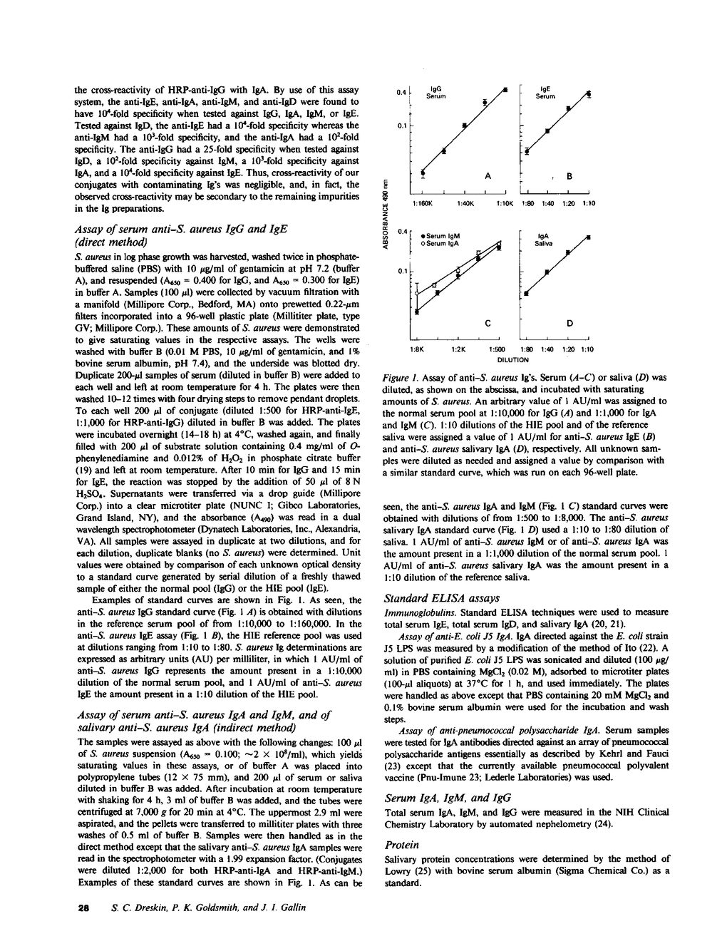 Patients with the hyperimmunoglobulin E and recurrent infection syndrome (HIE) characteristically have frequent skin and respiratory infections caused by Staphylococcus aureus. We have developed a set of enzyme-linked immunosorbent assays that use whole S. aureus (Wood's strain) immobilized on 0.22-micrometers filters and highly specific, affinity-purified enzyme conjugates of goat anti-human IgE, anti-human IgD, anti-human IgG, anti-human IgA, and anti-human IgM. These reagents were used to determine S. aureus-specific immunoglobulin (Ig) levels. As previously published, 10 patients with HIE had markedly higher levels of anti-S. aureus IgE than did 5 patients with eczema and recurrent superficial S. aureus infections (P less than 0.001). The HIE patients were also found to have a deficit of anti-S. aureus serum IgA as compared with 12 normal subjects, 12 patients with chronic granulomatous disease, 5 patients with chronic eczema and recurrent superficial S. aureus infections, and 3 patients with the Chediak-Higashi syndrome (P less than 0.01 for each comparison). In addition the HIE patients had an excess of anti-S. aureus IgM as compared with normal subjects (P less than 0.01). An expected excess of anti-S. aureus IgG was absent. These abnormalities cannot be explained by variations of total serum Ig levels or by a general inability to produce antigen-specific IgA because levels of naturally occurring IgA antibody against Escherichia coli lipopolysaccharide and the antigens of the pneumococcal vaccine are normal. Parotid saliva from patients with HIE contained less salivary IgA per milligram of protein (P less than 0.01) and less salivary anti-S. aureus IgA per milligram of protein (P less than 0.05) than did normal controls. The incidence of infection at mucosal surfaces and adjacent lymph nodes correlated inversely with serum anti-S. aureus IgA (r = -0.647, P = 0.034), serum anti-S. aureus IgE (r = -0.731, P = 0.016), total serum IgE (r = -0.714, P = 0.020), and total serum IgD (r = -0.597, P = 0.049). These findings are evidence of a previously undescribed immunoregulatory defect in patients with HIE, which may contribute to the increased susceptibility to infection in this syndrome.