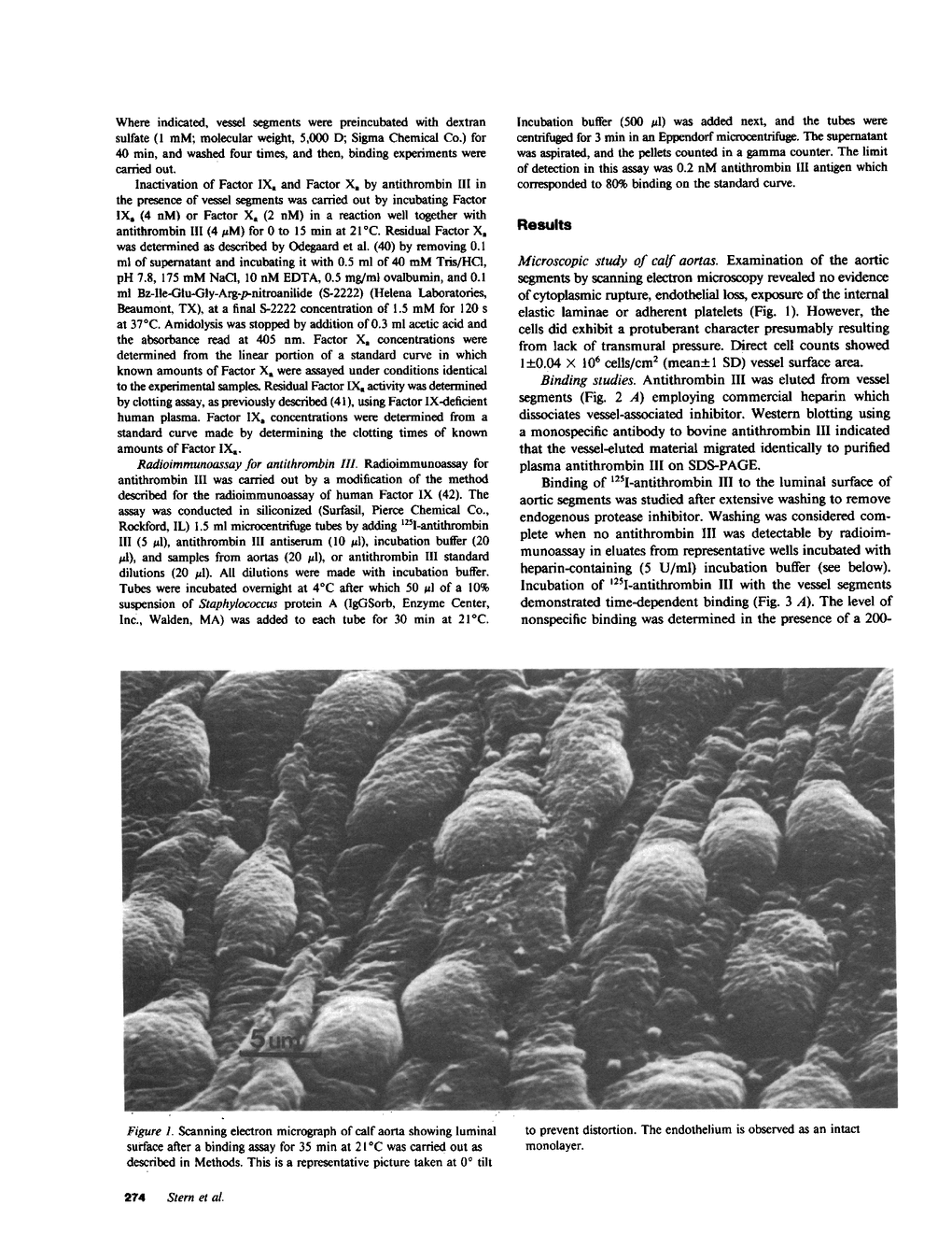 Bovine antithrombin III (AT III) interaction with the luminal surface of bovine aortic segments with a continuous layer of endothelium was examined. Incubation of 125I-AT III with vessel segments, previously washed free of endogenous AT III, demonstrated specific, time-dependent binding to the protease inhibitor to the endothelium. Half-maximal binding was observed at an added AT III concentration of 14 nM. Binding of 125I-AT III to the vessel wall was reversible (50% dissociated in 4 min), and addition of either heparin or Factor Xa accelerated displacement of 125I-AT III from the vessel segment. Dissociation of 125I-AT III from the vessel segment in the presence of factor Xa coincided with the formation of a Factor Xa-125I-AT III complex. Inactivation of Factor IXa and Factor Xa by AT III was facilitated in the presence of vessel segments. Pretreatment of vessel segments with highly purified Flavobacterium heparinase precluded the vessel-dependent augmentation of AT III anticoagulant activity as well as specific binding of 125I-AT III to the vessel endothelium. In contrast, pretreatment of the vessel segments with chrondroitinases (ABC or AC) had no detectable effect on 125I-AT III binding or on AT III anticoagulant activity. AT III binding to vessel segments was competitively inhibited by increasing concentration of platelet factor 4. Binding of the protease inhibitor to vessel segments was inhibited by chemical modification of AT III lysyl or tryptophan residues. These AT III derivatives retained progressive inhibitory activity. These data suggest that heparin-like molecules are present on the aortic vessel wall and mediate binding of AT III to the vessel surface, as well as enhancing the anticoagulant activity of AT III at these sites.