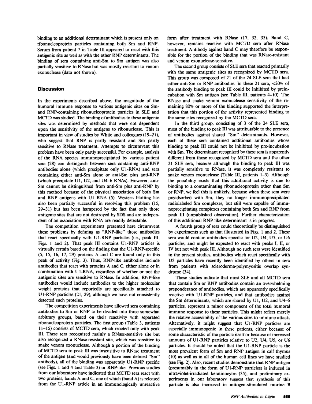 Ribonucleoprotein particles containing Sm antigen were separated from particles containing both Sm and RNP antigens by ion-exchange chromatography to study the recognition of these antigens by autoimmune sera. By using the separated antigens, anti-Sm and/or anti-RNP antibodies were detected in approximately 60% of sera from systemic lupus erythematosus patients by both enzyme-linked immunosorbent assay and immunoprecipitation of radiolabeled antigens followed by analysis on sodium dodecyl sulfate-polyacrylamide gels. These antibodies were detected in 30% of the same sera using the standard passive hemagglutination technique. Competition experiments demonstrated that all of the sera tested that contained anti-Sm antibodies also had anti-RNP-like reactivity. This latter reactivity usually represented 80% or more of the total Sm and RNP binding activity in lupus sera. The binding to RNP-like determinants by several of the sera was uniquely resistant to treatment of the antigen with snake venom exonuclease. These studies indicate that humoral immunity against Sm and RNP antigens in systemic lupus erythematosus is directed primarily against a single type of ribonucleoprotein particle in which the two antigens are physically associated. The specific binding to a single type of ribonucleoprotein particle suggests that this particle may be especially immunogenic and that it might play an important role in induction of the humoral immune response to Sm and RNP.