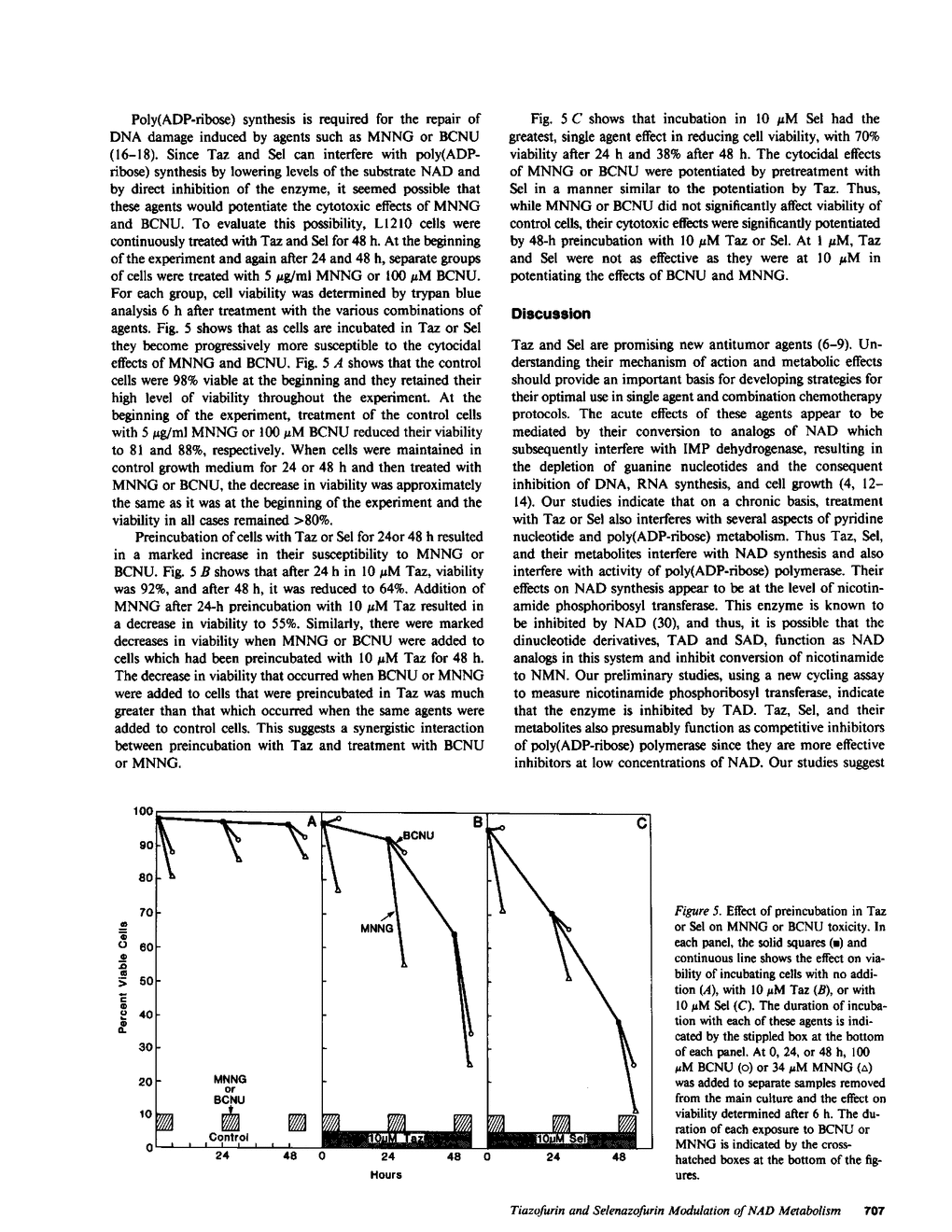 Tiazofurin (2-beta-D-ribofuranosylthiazole-4-carboxamide) and selenazofurin (2-beta-D-ribofuranosylselenazole-4-carboxamide) are synthetic "C" nucleosides whose antineoplastic activity depends on their conversion to tiazofurin-adenine dinucleotide and selenazofurin-adenine dinucleotide which are analogs of NAD. The present study was conducted to determine whether these nucleoside analogs and their dinucleotide derivatives interfere with NAD metabolism and in particular with the NAD-dependent enzyme, poly(ADP-ribose) polymerase. Incubation of L1210 cells with 10 microM tiazofurin or selenazofurin resulted in inhibition of cell growth, reduction of cellular NAD content, and interference with NAD synthesis. Using [14C]nicotinamide to study the uptake of nicotinamide and its conversion to NAD, we showed that the analogs interfere with NAD synthesis, apparently by blocking formation of nicotinamide mononucleotide. The analogs also serve as weak inhibitors of poly(ADP-ribose) polymerase, which is an NAD-utilizing, chromatin-bound enzyme, whose function is required for normal DNA repair processes. Continuous incubation of L1210 cells in tiazofurin or selenazofurin resulted in progressive and synergistic potentiation of the cytotoxic effects of DNA-damaging agents, such as 1,3-bis(2-chloroethyl)-1-nitrosourea or N-methyl-N'-nitro-N-nitrosoguanidine. These studies provide a basis for designing chemotherapy combinations in which tiazofurin or selenazofurin are used to modulate NAD and poly(ADP-ribose) metabolism to synergistically potentiate the effects of DNA strand-disrupting agents.