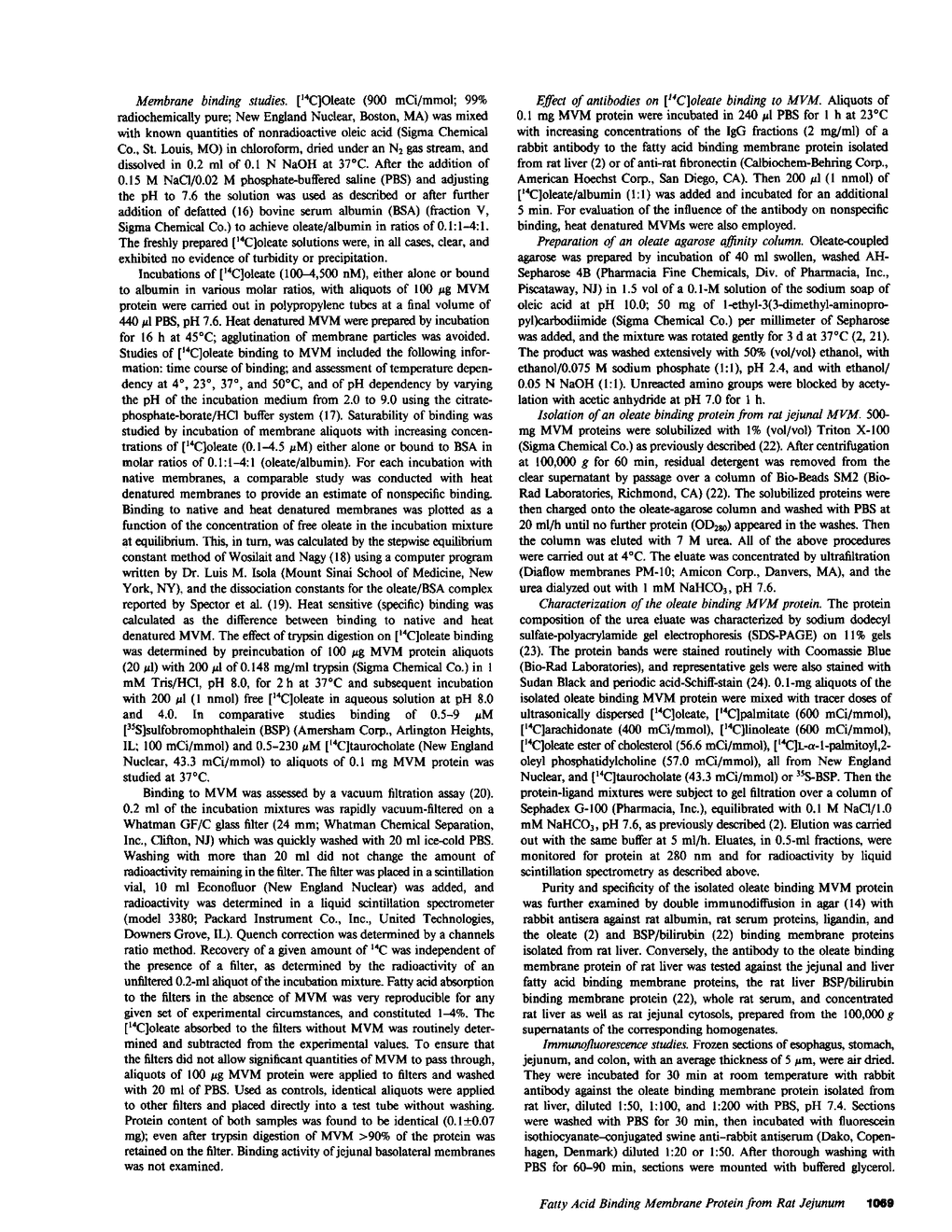 The mechanisms by which FFA are absorbed by the gut are unclear. To examine these processes, binding of [14C]oleate to isolated rat jejunal microvillous membranes (MVM) was studied in vitro. When [14C]oleate alone or compounded with bovine serum albumin at various molar ratios was incubated with MVM aliquots, binding was time- and temperature-dependent, inhibitable by addition of excess cold oleate, and decreased by heat denaturation or trypsin digestion of the membranes. When [14C]oleate binding to heat denatured MVM, which increased continuously as a function of the free oleate concentration and was taken as a measure of nonspecific binding, was subtracted from total binding to native MVM, a curve suggestive of saturable specific binding was observed. In contrast to fatty acids, there was no specific binding of [14C]taurocholate or [35S]sulfobromophthalein to jejunal MVM. After MVM solubilization with 1% Triton X-100, affinity chromatography over oleate-agarose and elution with 7 M urea yielded a single 40,000-mol-wt protein. This Sudan Black/periodic acid-Schiff-stain-negative protein co-chromatographed on Sephadex G-100 with [14C]oleate, [14C]palmitate, [14C]arachidonate, and [14C]linoleate, but not with the [14C]oleate ester of cholesterol, [14C]phosphatidylcholine, [14C]taurocholate, or [35S]sulfobromophthalein. A rabbit antibody to the previously reported hepatic membrane fatty acid binding protein (FABP) gave a single line of immunologic identity between the FABPs of rat jejunum and rat liver membrane. It inhibited the binding of [14C]oleate to native MVM but not heat denatured MVM, and, in immunohistochemical studies, demonstrated the presence of the FABP in the apical and lateral portions of the brush border cells of the jejunum, but not on the luminal surface of esophagus or colon. These data are compatible with the hypothesis that a specific FABP plays a role in fatty acid absorption from the gut.