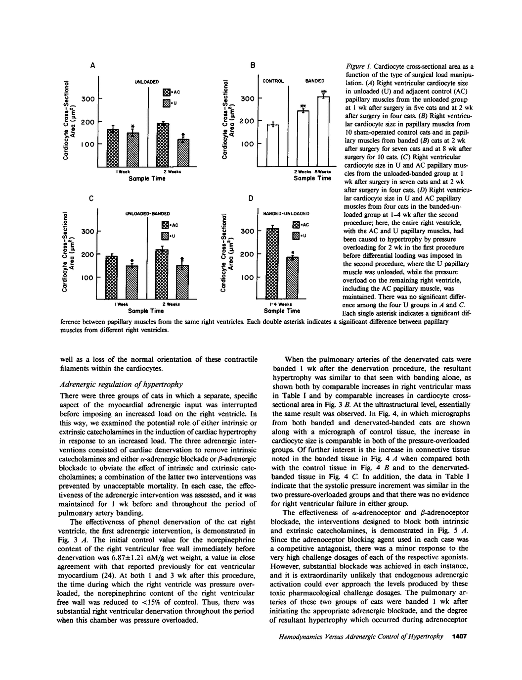 The purpose of this study was to determine whether cardiac hypertrophy in response to hemodynamic overloading is a primary result of the increased load or is instead a secondary result of such other factors as concurrent sympathetic activation. To make this distinction, four experiments were done; the major experimental result, cardiac hypertrophy, was assessed in terms of ventricular mass and cardiocyte cross-sectional area. In the first experiment, the cat right ventricle was loaded differentially by pressure overloading the ventricle, while unloading a constituent papillary muscle; this model was used to ask whether any endogenous or exogenous substance caused uniform hypertrophy, or whether locally appropriate load responses caused ventricular hypertrophy with papillary muscle atrophy. The latter result obtained, both when each aspect of differential loading was simultaneous and when a previously hypertrophied papillary muscle was unloaded in a pressure overloaded right ventricle. In the second experiment, epicardial denervation and then pressure overloading was used to assess the role of local neurogenic catecholamines in the genesis of hypertrophy. The degree of hypertrophy caused by these procedures was the same as that caused by pressure overloading alone. In the third and fourth experiments, beta-adrenoceptor or alpha-adrenoceptor blockade was produced before and maintained during pressure overloading. The hypertrophic response did not differ in either case from that caused by pressure overloading without adrenoceptor blockade. These experiments demonstrate the following: first, cardiac hypertrophy is a local response to increased load, so that any factor serving as a mediator of this response must be either locally generated or selectively active only in those cardiocytes in which stress and/or strain are increased; second, catecholamines are not that mediator, in that adrenergic activation is neither necessary for nor importantly modifies the cardiac hypertrophic response to an increased hemodynamic load.