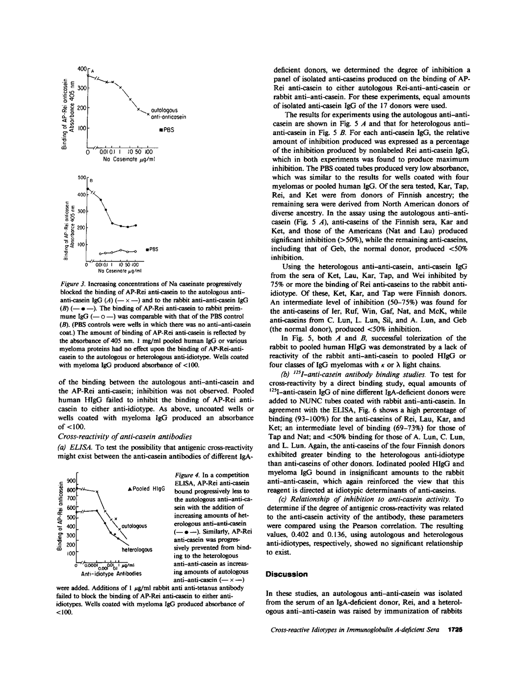 Mice of inbred strains immunized with simple antigens can produce antibodies that share similar V regions, which result in serologic similarities called cross-reactive idiotypes (CRI). In this study, we considered the possibility that IgA-deficient humans, who are continuously immunized via the intestinal tract by dietary protein, might also produce antibodies sharing CRI. For this, anti-casein antibodies were isolated from the blood of 16 adult IgA-deficient donors (4 Finns and 12 North Americans) and an autologous anti-anti-casein from the blood of one of the Finnish donors. In addition, a heterologous anti-anti-casein was raised to the casein-anti-casein immune complexes of this donor. Comparing the activities of the two anti-idiotypes, it was found that both bind anti-casein in the region of the antigen binding site, but that each binds additional determinants not located within this region, with the heterologous reagent having more affinity for these latter determinants than the autologous anti-idiotype. Using both reagents in enzyme-linked immunosorbent assay inhibition assays, extensive cross-reactivities between anti-caseins were demonstrated. Using the autologous anti-idiotype, 5 of 16 anti-caseins were found to share CRI, and with the heterologous reagent 12 of 16 shared CRI. In both assays, the anti-caseins of Finnish donors displayed more cross-reactivity than those derived from Northern American donors. These studies show that specific, commonly shared CRI can be identified in this human system in which antibodies are raised as a result of natural immunization across the gastrointestinal mucosa.