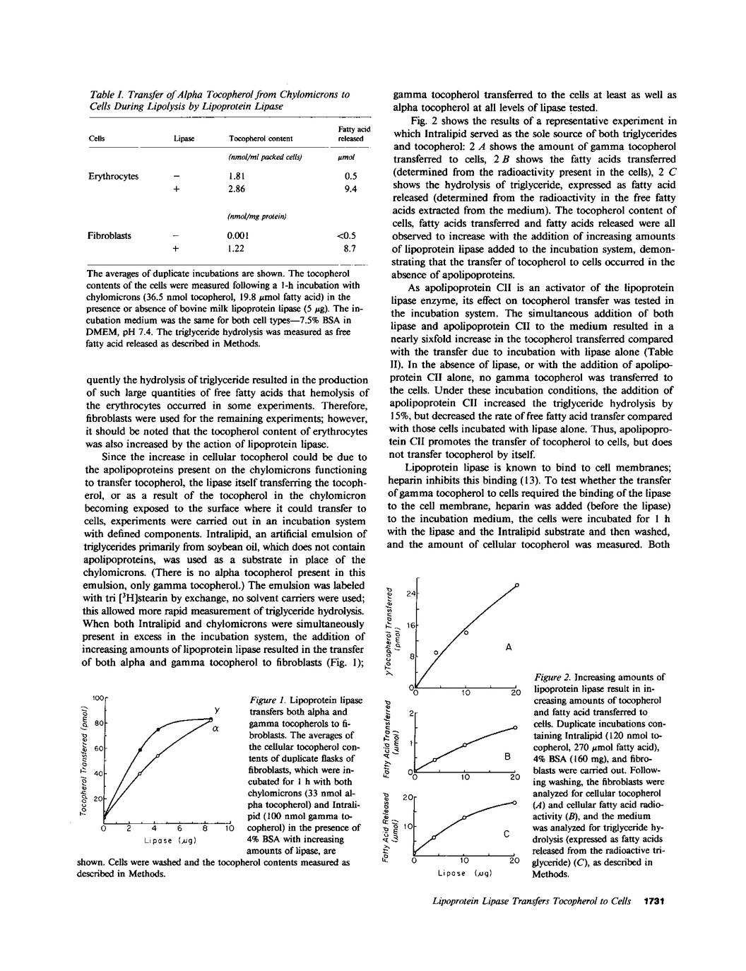 Lipoprotein lipase appears to function as the mechanism by which dietary vitamin E (tocopherol) is transferred from chylomicrons to tissues. In patients with lipoprotein lipase deficiency, more than 85% of both the circulating triglyceride and tocopherol is contained in the chylomicron fraction. The studies presented here show that the in vitro addition of bovine milk lipoprotein lipase (lipase) to chylomicrons in the presence of human erythrocytes or fibroblasts (and bovine serum albumin [BSA]) resulted in the hydrolysis of the triglyceride and the transfer of both fatty acids and tocopherol to the cells; in the absence of lipase, no increase in cellular tocopherol was detectable. The incubation system was simplified to include only fibroblasts, BSA, and Intralipid (an artificial lipid emulsion containing 10% soybean oil, which has gamma but not alpha tocopherol). The addition of lipase to this system also resulted in the transfer of tocopherol (gamma) to the fibroblasts. Addition of both lipase and its activator, apolipoprotein CII, resulted in a further increase in the cellular tocopherol content, but apolipoprotein CII alone had no effect. Heparin, which is known to prevent the binding of lipoprotein lipase to the cell surface membrane, abrogated the transfer of tocopherol to fibroblasts without altering the rate of triglyceride hydrolysis. Thus, in vitro tocopherol is transferred to cells during hydrolysis of triglyceride by the action of lipase, and for this transfer of tocopherol to occur, the lipase itself must bind to the cell membrane.