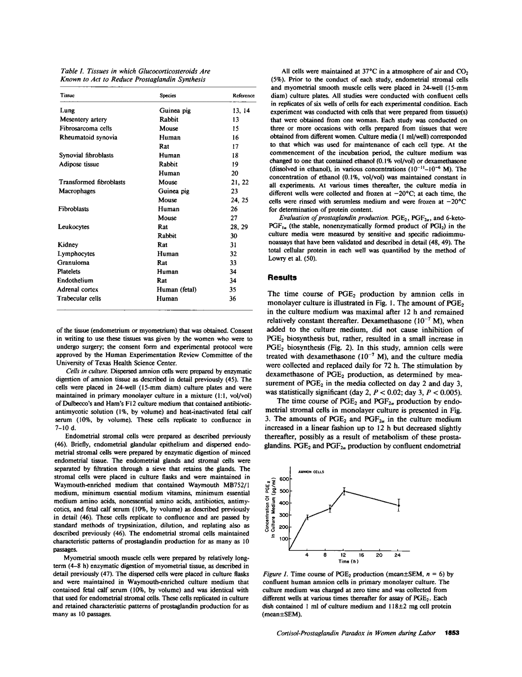 In this investigation, we sought to resolve the apparent paradox that is posed by the fact that there is a simultaneous increase in the production of prostaglandin and cortisol in women during labor. A paradox obtains, since in most tissues, cortisol acts to inhibit prostaglandin formation. Using previously characterized model systems for the in vitro study of arachidonic acid metabolism in amnion, decidua, and myometrium, we found that prostaglandin production by amnion and endometrial stromal cells in monolayer culture was not decreased by glucocorticosteroid treatment. On the other hand, prostaglandin production by myometrial smooth muscle cells in culture was inhibited by greater than 90% in response to dexamethasone (10(-7) M) treatment. Importantly, the major prostaglandin produced by myometrium, as well as myometrial smooth muscle cells in culture, is prostacyclin, a prostaglandin that acts to cause uterine quiescence. We suggest that the immunity of amnion and decidua to the action of glucocorticosteroids may allow for the accelerated production of prostaglandins E2 and F2 alpha, which act to cause myometrial contractions; simultaneously, glucocorticosteroid produced in large quantities in women in labor may lead to decreased production of prostacyclin by myometrium, thereby reducing uterine quiescence. In this coordinated manner, the uterine contractions that culminate in delivery of the fetus may proceed uninterrupted in the face of increased cortisol production.
