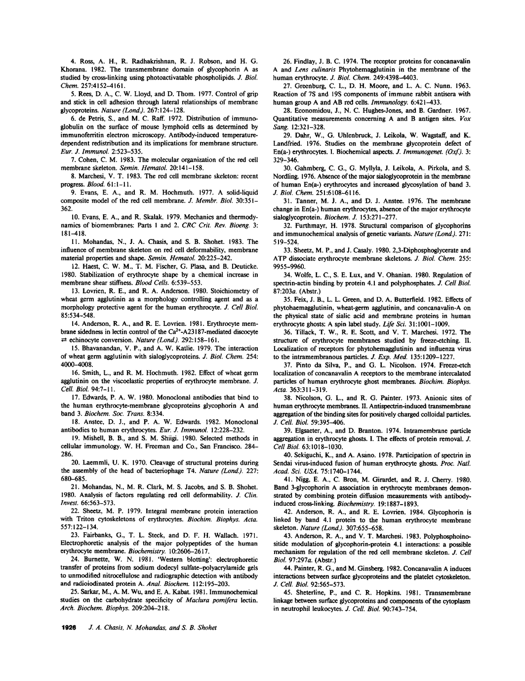 Erythrocyte skeletal proteins are known to play an important role in determining membrane deformability. In order to see whether transmembrane proteins also influence deformability and, if so, whether this influence is mediated by an interaction with the membrane skeleton, we examined the effect on deformability of ligands specific for transmembrane proteins. We found membrane deformability markedly reduced in erythrocytes that were pretreated with glycophorin A-specific ligands. In contrast, ligands specific for band 3 and A and B blood group antigens had no effect. The increase in membrane rigidity appeared to depend upon a transmembrane event and not upon a rigidity-inducing lattice on the outside surface of the cell in that a monovalent Fab of antiglycophorin IgG caused decreased deformability. We therefore looked for a ligand-induced association of glycophorin and the skeletal proteins and found, in Triton X-100-insoluble residues, a partitioning of glycophorin with the skeletal proteins only after preincubation with a ligand specific for glycophorin. We then studied cells and resealed membranes with skeletal protein abnormalities. In spectrin-deficient and protein 4.1-deficient erythrocytes and in 2,3-diphosphoglycerate-treated resealed membranes, the antiglycophorin IgG was only one-third as effective in decreasing deformability as it was in normal cells. Thus, normal skeletal proteins appear to be essential for liganded glycophorin to affect membrane deformability maximally. Taken together, these observations indicate that there is a ligand-induced interaction between glycophorin A and skeletal proteins and that this interaction can directly influence membrane deformability.