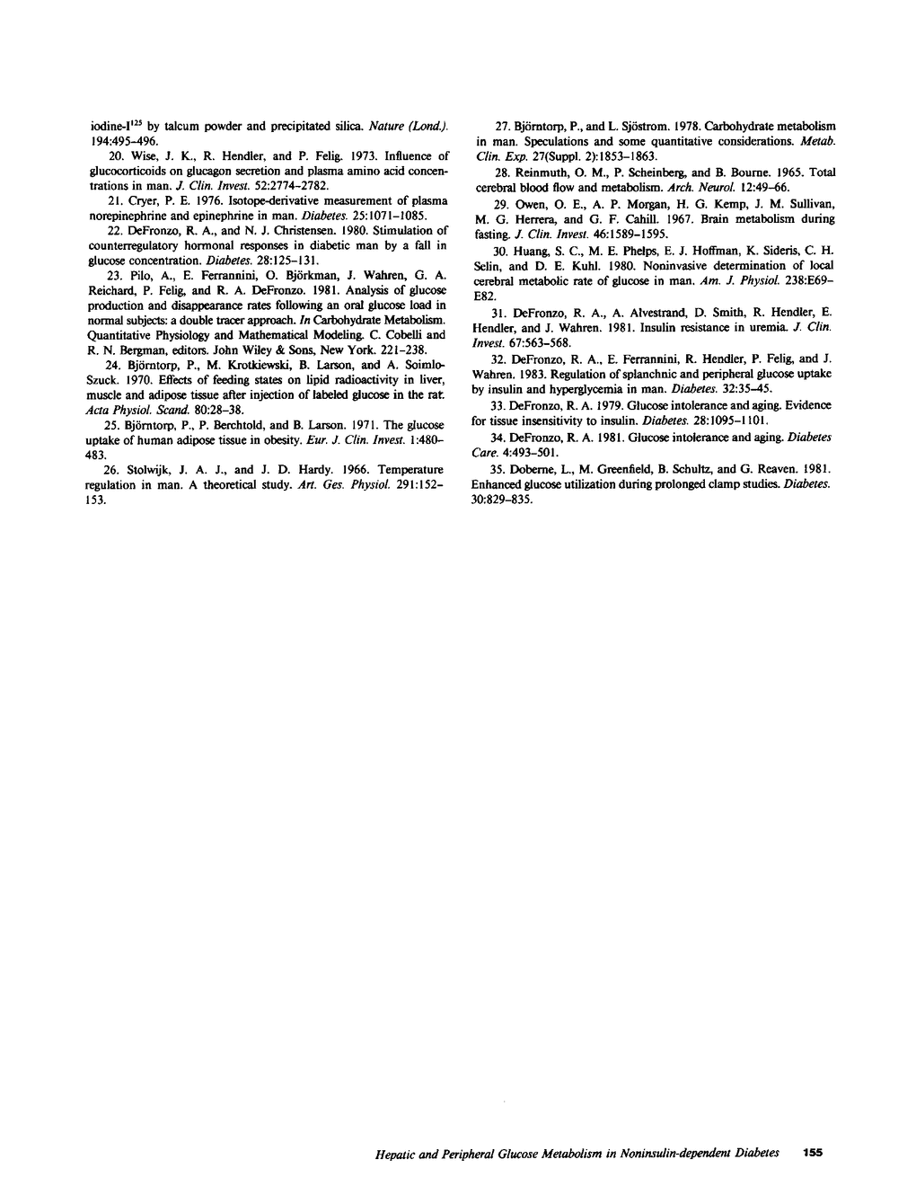 The mechanism(s) and site(s) of the insulin resistance were examined in nine normal-weight noninsulin-dependent diabetic (NIDD) subjects. The euglycemic insulin clamp technique (insulin concentration approximately 100 microU/ml) was employed in combination with hepatic and femoral venous catheterization and measurement of endogenous glucose production using infusion of tritiated glucose. Total body glucose metabolism in the NIDD subjects (4.37 +/- 0.45 mg/kg per min) was 38% (P less than 0.01) lower than in controls (7.04 +/- 0.63 mg/kg per min). Quantitatively, the most important site of the insulin resistance was found to be in peripheral tissues. Leg glucose uptake in the diabetic group was reduced by 45% as compared with that in controls (6.0 +/- 0.2 vs. 11.0 +/- 0.1 mg/kg leg wt per min; P less than 0.01). A strong positive correlation was observed between leg and total body glucose uptake (r = 0.70, P less than 0.001). Assuming that muscle is the primary leg tissue responsible for glucose uptake, it could be estimated that 90 and 87% of the infused glucose was disposed of by peripheral tissues in the control and NIDD subjects, respectively. Net splanchnic glucose balance during insulin stimulation was slightly more positive in the control than in the diabetic subjects (0.31 +/- 0.10 vs. 0.05 +/- 0.19 mg/kg per min; P less than 0.07). The difference (0.26 mg/kg per min) in net splanchnic glucose balance in NIDD represented only 10% of the reduction (2.67 mg/kg per min) in total body glucose uptake in the NIDD group and thus contributed very little to the insulin resistance. The results emphasize the importance of the peripheral tissues in the disposal of infused glucose and indicate that muscle is the most important site of the insulin resistance in NIDD.