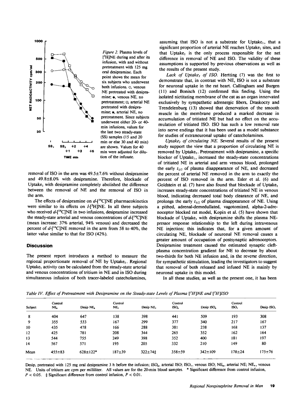 We describe here and validate an in vivo technique to measure the regional proportionate removal of norepinephrine (NE) by neuronal uptake (Uptake1) in man. The measurement is based on the steady-state arterial and venous concentrations of tritiated NE and tritiated isoproterenol (ISO) during simultaneous infusion of both. The validity of this technique depends on the removal of circulating NE, but not of ISO, by sympathetic nerve endings and on there being no other factor contributing to the net difference in the plasma disappearance of these catecholamines. To test these hypotheses, we compared the removal of NE in the arm with that of ISO in 14 people and the effects of pretreatment with the specific inhibitor of Uptake1, desipramine, in 8 people. In all the subjects a greater percent of NE than of ISO was removed during passage of blood through the forearm (54 vs. 46%, P less than 0.0001). Pretreatment with desipramine decreased significantly the removal of NE to virtually exactly that of ISO. The difference in NE and ISO clearances by arm tissues was therefore completely accounted for by Uptake1. About 15% of infused NE which is removed in the arm is removed by Uptake1. The ability to measure regional Uptake1 should contribute to better understanding of the relationship between circulating levels of plasma NE and sympathetic neural activity and may allow detection of abnormalities of neuronal norepinephrine removal in clinical disease states.