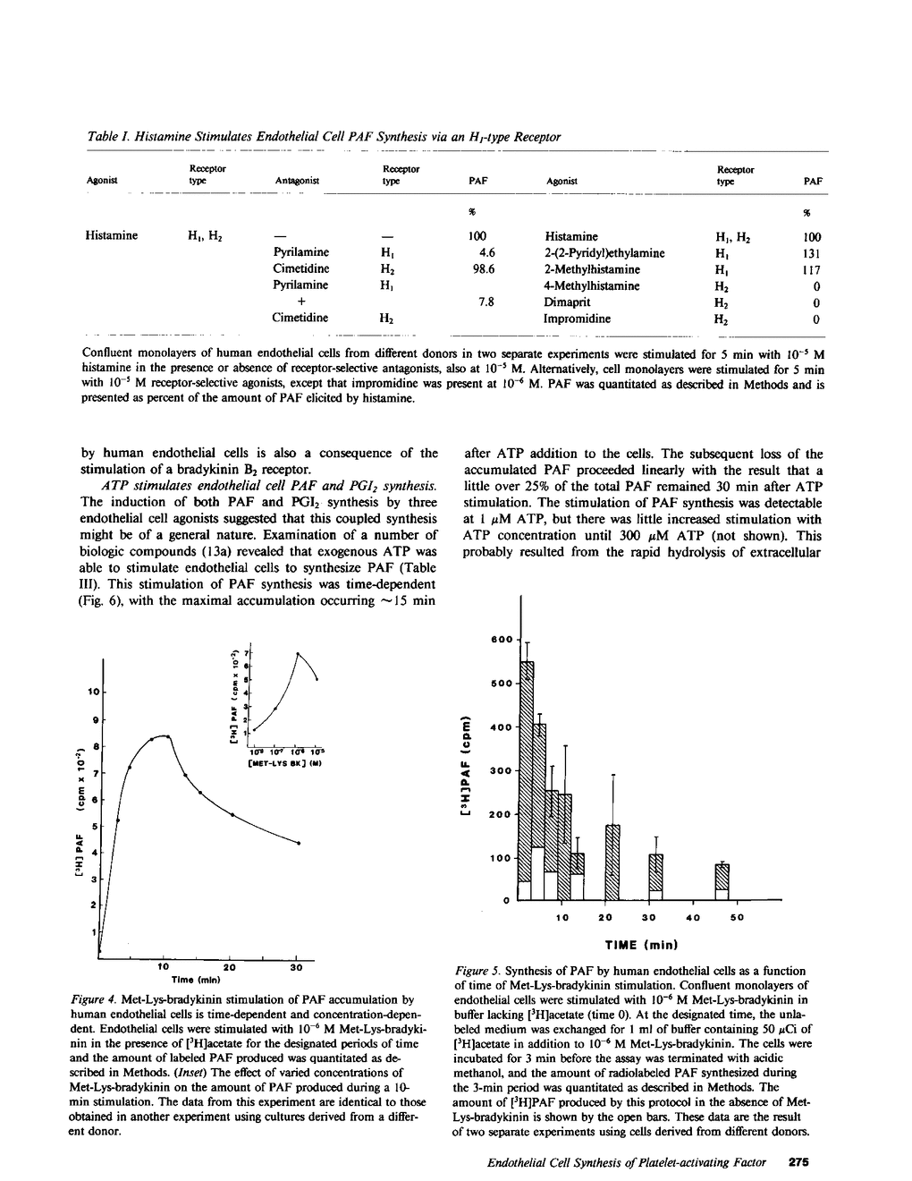 Cultured human endothelial cells synthesize prostacyclin (PGI2), a potent inhibitor of platelet function, when stimulated with histamine, bradykinin, or ATP. Paradoxically, we report that these agonists also induced the rapid and sustained synthesis of platelet-activating factor (PAF) by endothelial cells. In fact, the synthesis of this potent activator of platelets and neutrophils was induced by stimulation of the same receptor subtype that induced PGI2 synthesis: stimulation of a histamine H1 or a bradykinin B2 receptor induced both PAF and PGI2 synthesis. However, two physiologically important differences exist between the production of PAF and PGI2 by endothelial cells. The synthesis of PGI2 proceeded for only 7.5 min before the abrupt termination of synthesis, whereas the synthesis of PAF was clearly detectable even 45 min after stimulation. Although maximal accumulation of PAF occurred after 10-15 min of stimulation, the prolonged synthesis resulted in the presence of PAF for up to 1 h after stimulation. Secondly, whereas PGI2 was released from the cell monolayer, PAF remained cell-associated without significant release to the external medium. Endothelial cell-generated PAF, therefore, does not function as a hormone. The prolonged association of this potent activator of platelets and neutrophils with endothelial cells may mediate some of the inflammatory properties of histamine and bradykinin. It may also be a factor in the formation of a thrombogenic vascular surface, an event suggested to play a primary role in the pathogenesis of thrombosis and atherosclerosis.