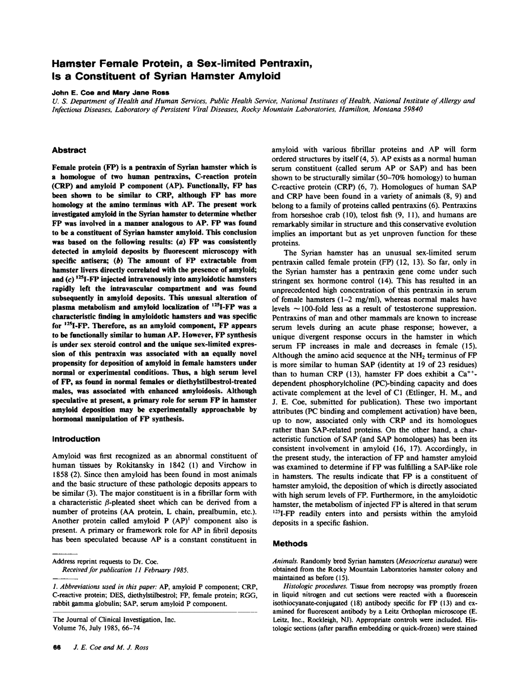 Female protein (FP) is a pentraxin of Syrian hamster which is a homologue of two human pentraxins, C-reaction protein (CRP) and amyloid P component (AP). Functionally, FP has been shown to be similar to CRP, although FP has more homology at the amino terminus with AP. The present work investigated amyloid in the Syrian hamster to determine whether FP was involved in a manner analogous to AP. FP was found to be a constituent of Syrian hamster amyloid. This conclusion was based on the following results: (a) FP was consistently detected in amyloid deposits by fluorescent microscopy with specific antisera; (b) The amount of FP extractable from hamster livers directly correlated with the presence of amyloid; and (c) 125I-FP injected intravenously into amyloidotic hamsters rapidly left the intravascular compartment and was found subsequently in amyloid deposits. This unusual alteration of plasma metabolism and amyloid localization of 125I-FP was a characteristic finding in amyloidotic hamsters and was specific for 125I-FP. Therefore, as an amyloid component, FP appears to be functionally similar to human AP. However, FP synthesis is under sex steroid control and the unique sex-limited expression of this pentraxin was associated with an equally novel propensity for deposition of amyloid in female hamsters under normal or experimental conditions. Thus, a high serum level of FP, as found in normal females or diethylstilbestrol-treated males, was associated with enhanced amyloidosis. Although speculative at present, a primary role for serum FP in hamster amyloid deposition may be experimentally approachable by hormonal manipulation of FP synthesis.