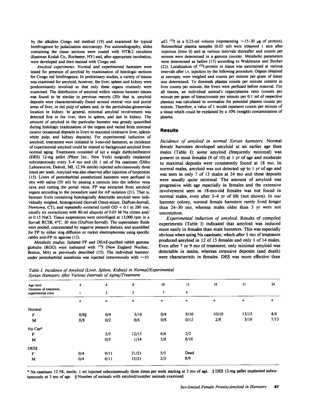 Female protein (FP) is a pentraxin of Syrian hamster which is a homologue of two human pentraxins, C-reaction protein (CRP) and amyloid P component (AP). Functionally, FP has been shown to be similar to CRP, although FP has more homology at the amino terminus with AP. The present work investigated amyloid in the Syrian hamster to determine whether FP was involved in a manner analogous to AP. FP was found to be a constituent of Syrian hamster amyloid. This conclusion was based on the following results: (a) FP was consistently detected in amyloid deposits by fluorescent microscopy with specific antisera; (b) The amount of FP extractable from hamster livers directly correlated with the presence of amyloid; and (c) 125I-FP injected intravenously into amyloidotic hamsters rapidly left the intravascular compartment and was found subsequently in amyloid deposits. This unusual alteration of plasma metabolism and amyloid localization of 125I-FP was a characteristic finding in amyloidotic hamsters and was specific for 125I-FP. Therefore, as an amyloid component, FP appears to be functionally similar to human AP. However, FP synthesis is under sex steroid control and the unique sex-limited expression of this pentraxin was associated with an equally novel propensity for deposition of amyloid in female hamsters under normal or experimental conditions. Thus, a high serum level of FP, as found in normal females or diethylstilbestrol-treated males, was associated with enhanced amyloidosis. Although speculative at present, a primary role for serum FP in hamster amyloid deposition may be experimentally approachable by hormonal manipulation of FP synthesis.