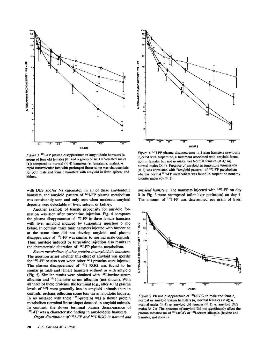 Female protein (FP) is a pentraxin of Syrian hamster which is a homologue of two human pentraxins, C-reaction protein (CRP) and amyloid P component (AP). Functionally, FP has been shown to be similar to CRP, although FP has more homology at the amino terminus with AP. The present work investigated amyloid in the Syrian hamster to determine whether FP was involved in a manner analogous to AP. FP was found to be a constituent of Syrian hamster amyloid. This conclusion was based on the following results: (a) FP was consistently detected in amyloid deposits by fluorescent microscopy with specific antisera; (b) The amount of FP extractable from hamster livers directly correlated with the presence of amyloid; and (c) 125I-FP injected intravenously into amyloidotic hamsters rapidly left the intravascular compartment and was found subsequently in amyloid deposits. This unusual alteration of plasma metabolism and amyloid localization of 125I-FP was a characteristic finding in amyloidotic hamsters and was specific for 125I-FP. Therefore, as an amyloid component, FP appears to be functionally similar to human AP. However, FP synthesis is under sex steroid control and the unique sex-limited expression of this pentraxin was associated with an equally novel propensity for deposition of amyloid in female hamsters under normal or experimental conditions. Thus, a high serum level of FP, as found in normal females or diethylstilbestrol-treated males, was associated with enhanced amyloidosis. Although speculative at present, a primary role for serum FP in hamster amyloid deposition may be experimentally approachable by hormonal manipulation of FP synthesis.