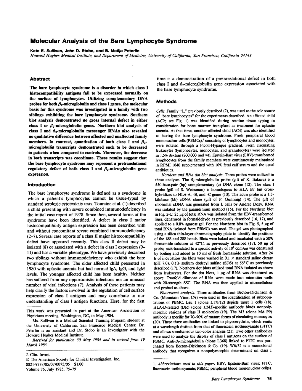The bare lymphocyte syndrome is a disorder in which class I histocompatibility antigens fail to be expressed normally on the surface of lymphocytes. Utilizing complementary DNA probes for both beta 2-microglobulin and class I genes, the molecular basis for this syndrome was investigated in a family with two siblings exhibiting the bare lymphocyte syndrome. Southern blot analysis demonstrated no gross internal defect in either class I or beta 2-microglobulin genes. Northern blot analysis of class I and beta 2-microglobulin messenger RNAs also revealed no qualitative difference between affected and unaffected family members. In contrast, quantitation of both class I and beta 2-microglobulin transcripts demonstrated each to be decreased in patients when compared to controls. Moreover, the decrease in both transcripts was coordinate. These results suggest that the bare lymphocyte syndrome may represent a pretranslational regulatory defect of both class I and beta 2-microglobulin gene expression.