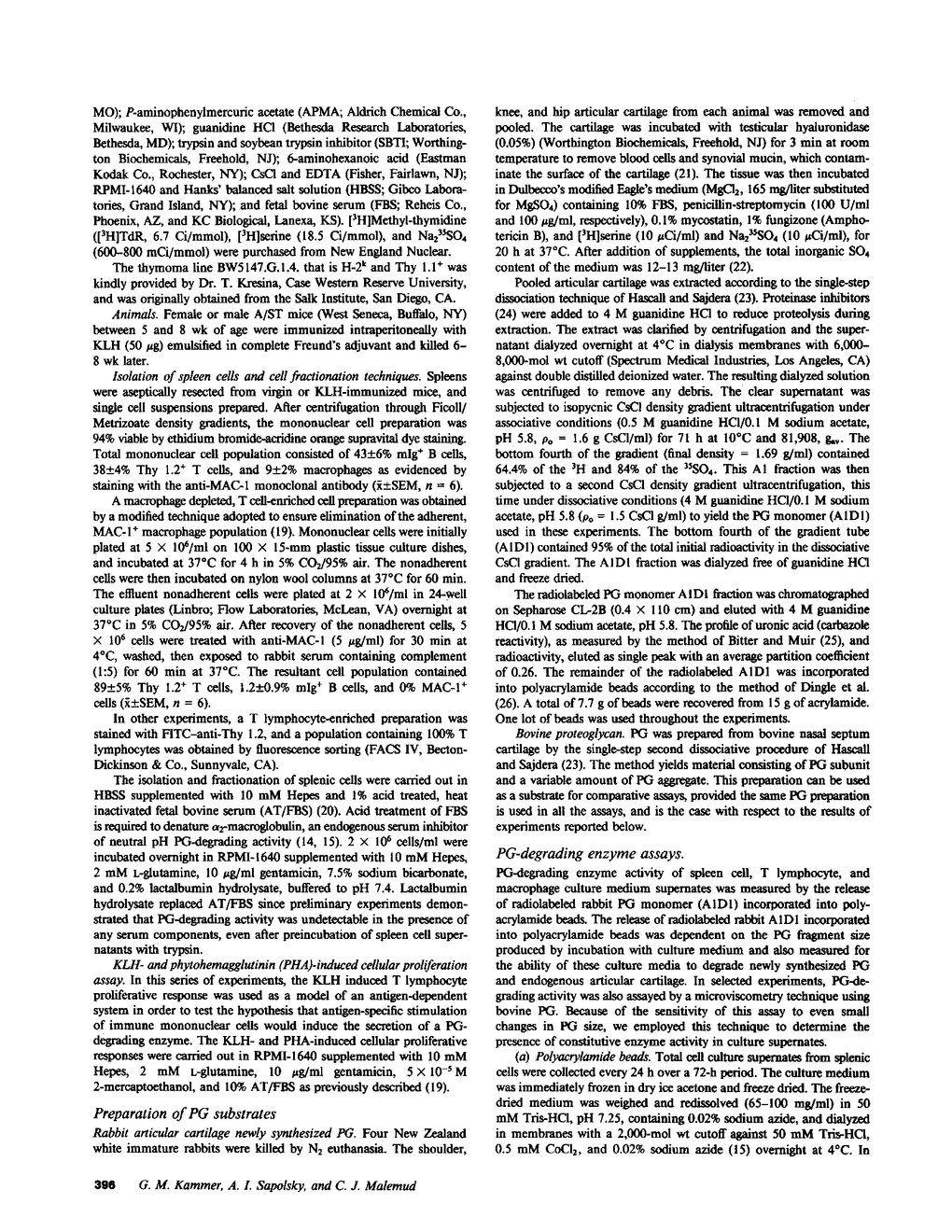 Destruction of articular cartilage is the hallmark of inflammatory arthritides. Enzymes elaborated by mononuclear cells infiltrating the synovium mediate, in part, the degradation of the cartilage extracellular matrix. Since mononuclear cells are the dominant cell type found in chronic inflammatory synovitis, we investigated whether interaction of immune mononuclear cells with antigen initiated the synthesis and secretion of a proteoglycan-degrading enzyme activity. Proteoglycan-degrading enzyme activity was monitored by the capacity of murine spleen cell conditioned medium to release [3H]serine/35SO4 incorporated into rabbit cartilage proteoglycan monomer fraction (A1D1), and by the relative change in specific viscosity of bovine nasal cartilage proteoglycan monomer. The results demonstrated that both virgin and immune mononuclear cells spontaneously generated proteoglycan-degrading enzyme activity and that cellular activation and proliferation induced by the antigen keyhole limpet hemocyanin or the mitogen phytohemagglutinin was not required. Kinetic studies demonstrated stable release of the enzyme activity over 72 h. Cell separation studies showed that T lymphocytes, a thymoma line, and macrophages separately produced proteoglycan-degrading enzyme activity. The enzyme activity has been partially characterized and appears to belong to a class of neutral pH metal-dependent proteinases. These observations, the first to demonstrate that T lymphocytes secrete an enzyme capable of degrading cartilage proteoglycan, raise the possibility that this enzyme activity contributes to cartilage extracellular matrix destruction in vivo. Moreover, these data support the conclusion that production of this enzyme by T lymphocytes is independent of an antigen-specific stimulus.