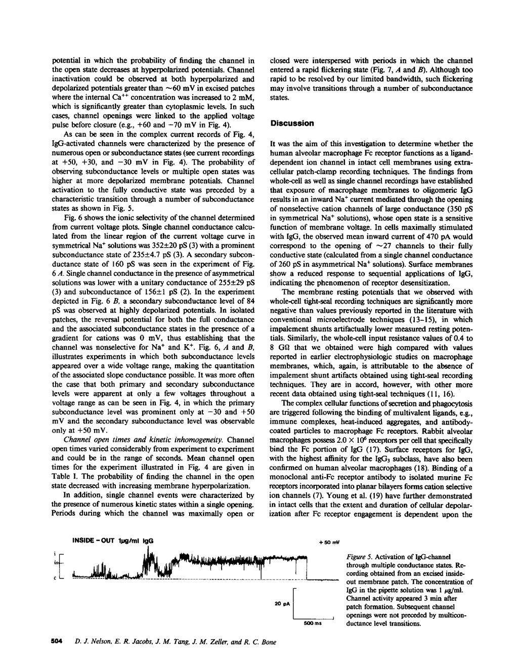 While it is well known that the engagement of IgG Fc receptors on the macrophage surface triggers a number of cellular responses, including particle ingestion, secretion, and respiratory burst activity, the mechanism of signal transmission following ligand binding remains poorly understood. To acquire more data in this area, we studied the electrical properties of the macrophage membrane and its response to oligomeric immunoglobulin G (IgG) using the patch-clamp technique on human alveolar macrophages that were obtained by bronchoalveolar lavage and maintained in short-term tissue culture. The results showed that cell resting potentials, as determined from whole-cell tight seal recordings, increased from -15 mV on the day of plating to -56 mV after the first day in culture and remained stable at this hyperpolarized level. Macrophages revealed an input resistance of 3.3 G omega, independent of age in culture. Extracellular application of heat-aggregated human IgG to cells voltage-clamped at -70 mV resulted in peak inward currents of approximately 470 pA. We identified an IgG-dependent, nonselective channel in both cell-attached and isolated membrane patches, with a unitary conductance of approximately 350 pS and a predominant subconductance level of 235 pS in symmetrical NaCl solutions. Single channel open times were observed to be in the range of seconds and, in addition, were dependent upon membrane voltage. Channel opening involved transitions between a number of kinetic states and subconductance levels. Channel events recorded in cell-attached patches showed characteristic exponential relaxations, which implied a variation in membrane potential as a result of a single ion channel opening. These data suggest that the IgG-dependent nonselective cation channel that we have characterized may provide the link between Fc receptor engagement and subsequent cellular activation.