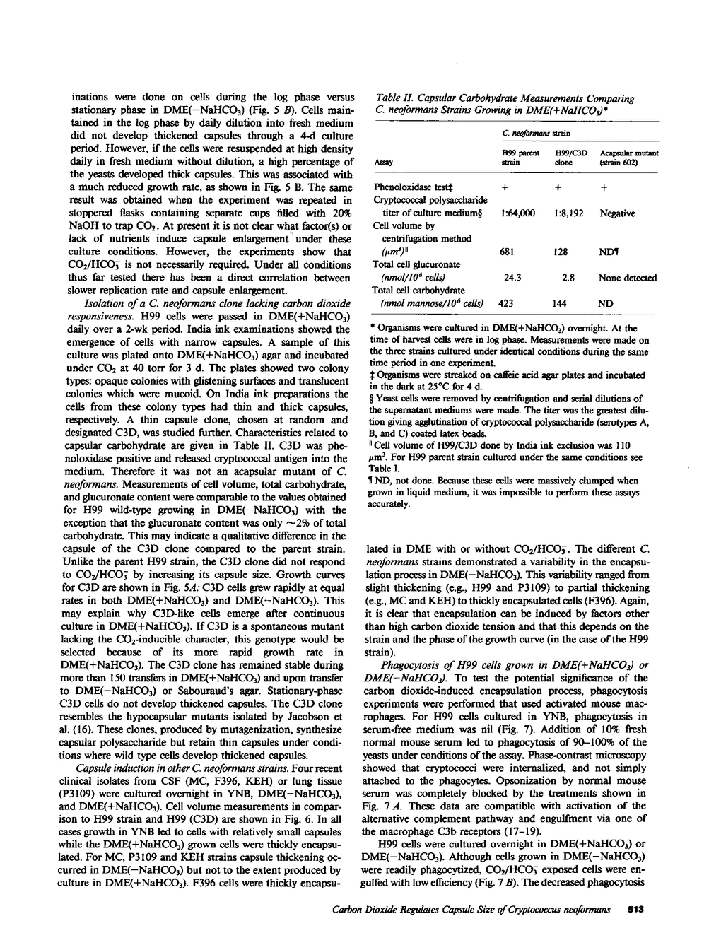 Cryptococcus neoformans is variably encapsulated in vitro, whereas in tissues it develops a large capsule. We observed that cells of a strain with thin capsules, when growing in a standard fungal culture medium, became heavily encapsulated when incubated in serum-free cell culture medium (Dulbecco's modified Eagle's medium [DME]). Capsule size was quantitated physically by measuring cell volume, and chemically by determining the content of a capsular monosaccharide, glucuronate. The CO2/HCO-3 couple stimulated capsule development, resulting in visible enlargement by 3 h after exposure to high CO2/HCO-3. The amount of capsule per cell was directly proportional to the total millimolar CO2/HCO-3 concentration between 24 and 2.4 mM at pH 7.35, but at constant PCO2 (40 torr) and varying [HCO-3], the cells were heavily encapsulated down to pH 6.8. Concentration of CO2/HCO-3 in the physiologic range increased elaboration of polysaccharide into the medium and slowed the cell generation time from 2 to 6 h. Four other first-passage clinical isolates were all heavily encapsulated in DME with CO2/HCO-3, but variably encapsulated in DME without CO2/HCO-3. Exposure of yeast to increased CO2/HCO-3 caused a marked reduction in complement-mediated phagocytosis by mouse macrophages. A stable clone was isolated which contained capsular polysaccharide, but lacked the CO2-inducible phenotype. This clone was avirulent for steroid-treated rabbits. Thus, the prevailing CO2 concentration in mammalian tissues may be one stimulus for capsular polysaccharide synthesis. This could serve as an adaptive mechanism favoring parasite survival in the host.