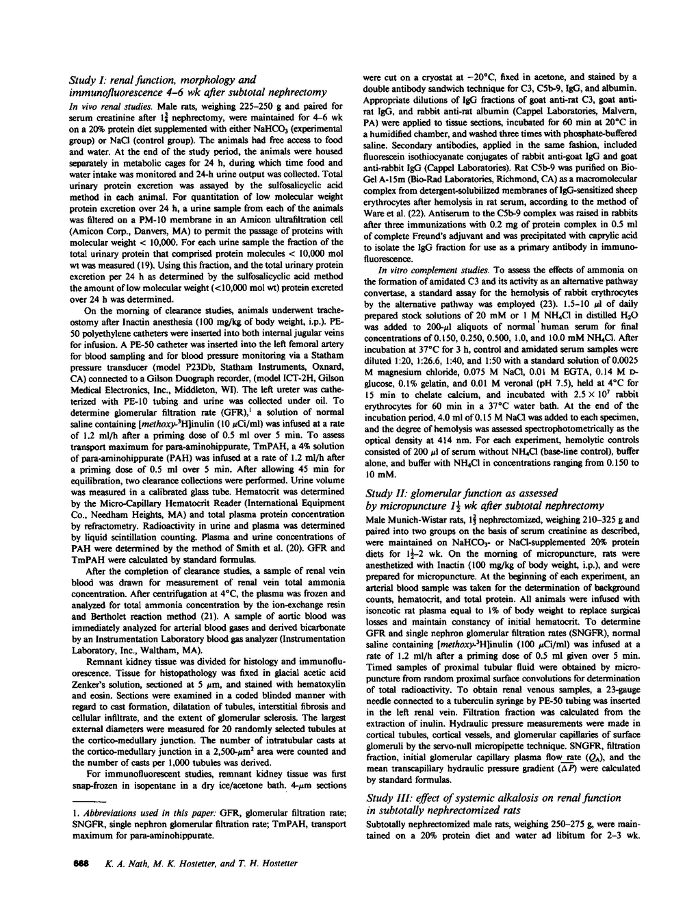 The human end-stage kidney and its experimental analogue, the remnant kidney in the rat, exhibit widespread tubulo-interstitial disease. We investigated whether the pathogenesis of such tubulo-interstitial injury is dependent upon adaptive changes in tubular function and, in particular, in ammonia production when renal mass is reduced. Dietary acid load was reduced in 1 3/4-nephrectomized rats by dietary supplementation with sodium bicarbonate (NaHCO3), while control rats, paired for serum creatinine after 1 3/4 nephrectomy, were supplemented with equimolar sodium chloride. After 4-6 wk, NaHCO3-supplemented rats demonstrated less impairment of tubular function as measured by urinary excretory rates for total protein and low molecular weight protein and higher transport maximum for para-aminohippurate per unit glomerular filtration rate, less histologic evidence of tubulo-interstitial damage, less deposition of complement components C3 and C5b-9, and a lower renal vein total ammonia concentration. Such differences in tubular function could not be accounted for simply on the basis of systemic alkalinization, and differences in tubular injury could not be ascribed to differences in glomerular function. Because nitrogen nucleophiles such as ammonia react with C3 to form a convertase for the alternative complement pathway, and because increased tissue levels of ammonia are associated with increased tubulo-interstitial injury, we propose that augmented intrarenal levels of ammonia are injurious because of activation of the alternative complement pathway. Chemotactic and cytolytic complement components are thereby generated, leading to tubulo-interstitial inflammation. Thus, alkali supplementation reduces chronic tubulo-interstitial disease in the remnant kidney of the rat, and we propose that this results, at least in part, from reduction in cortical ammonia and its interaction with the alternative complement pathway.