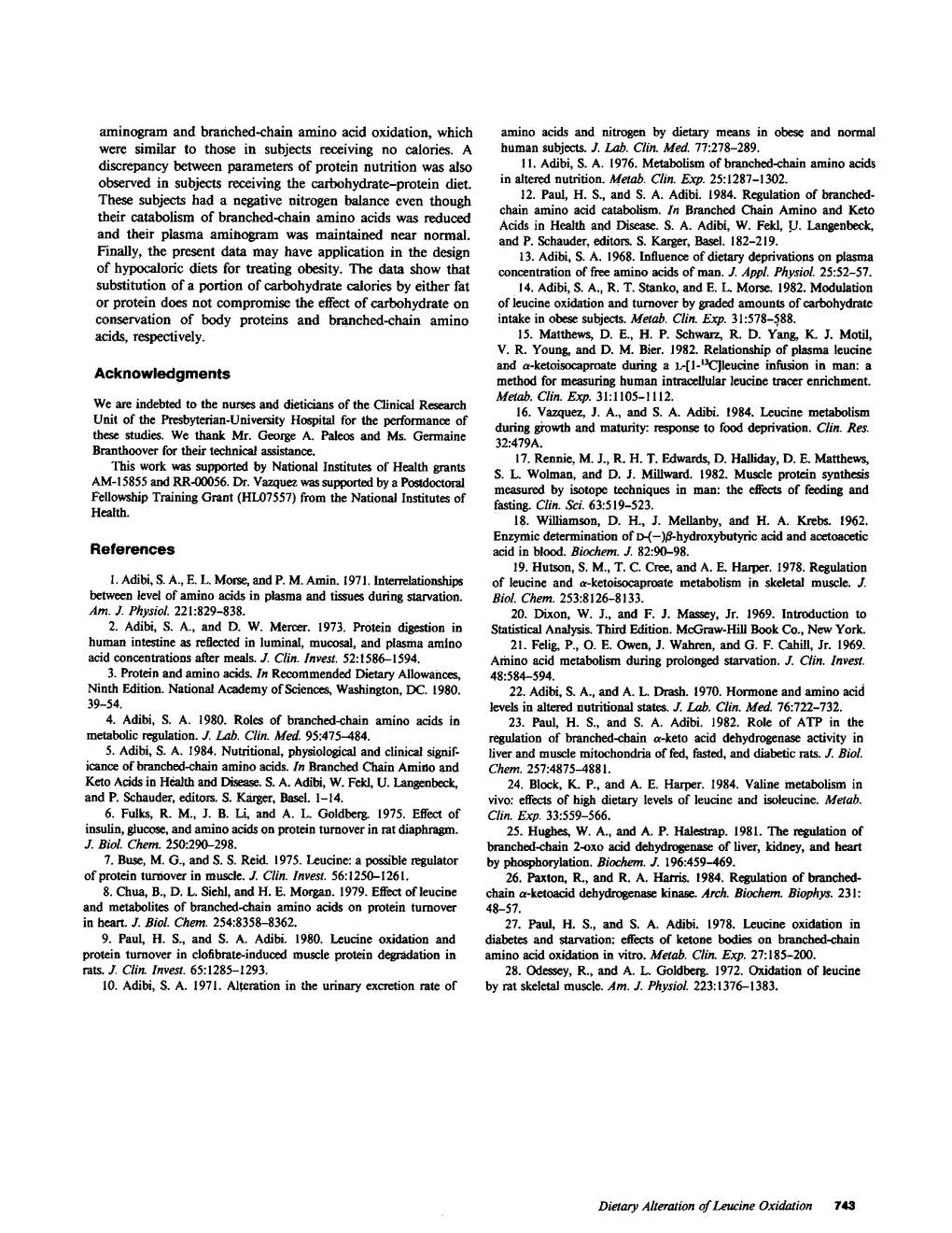 To assess the effect of each dietary caloric source on the catabolism of branched-chain amino acids, we investigated the rate of leucine oxidation before and after obese volunteers consumed one of the following diets for one week: (a) starvation, (b) 300 or 500 cal of fat/d, (c) 300 or 500 cal of carbohydrate/d, (d) 300 or 500 cal of protein/d, (e) a mixture of carbohydrate (300 cal/d) and fat (200 cal/d), or (f) a mixture of carbohydrate (300 cal/d) and protein (200 cal/d). Starvation significantly increased the rate of leucine oxidation (1.4 +/- 0.11 vs. 1.8 +/- 0.16 mmol/h, P less than 0.01). The same occurred with the fat and protein diets. In sharp contrast, the 500-cal carbohydrate diet significantly decreased the rate of leucine oxidation (1.3 +/- 0.13 vs. 0.6 +/- 0.09 mmol/h, P less than 0.01). The same occurred when a portion of the carbohydrate diet was isocalorically replaced with either fat or protein. The cumulative nitrogen excretion during the fat diet and starvation was not significantly different. As compared with the fat diets, the carbohydrate diets on the average reduced the urinary nitrogen excretion by 12 g/wk. Nitrogen balance was positive during the consumption of the 500-cal protein diet, but negative during the consumption of carbohydrate-protein diet. The fat diets, like the protein diets and starvation, greatly increased plasma leucine (119 +/- 13 vs. 222 +/- 15 microM, P less than 0.01) and beta-hydroxybutyrate (0.12 +/- 0.02 vs. 4.08 +/- 0.43 mM, P less than 0.01) concentrations, and significantly decreased plasma glucose (96 +/- 4 vs. 66 +/- 3 mg/dl, P less than 0.01) and insulin (18 +/- 4 vs. 9 +/- 1 microU/ml, P less than 0.05) concentrations. These changes did not occur, or were greatly attenuated, when subjects consumed carbohydrate alone or in combination with fat or protein. We conclude that during brief caloric restriction, dietary lipid and protein, unlike carbohydrate, do not diminish the catabolism of branched-chain amino acids and the decrease in branched-chain amino acid oxidation is associated with protein sparing.
