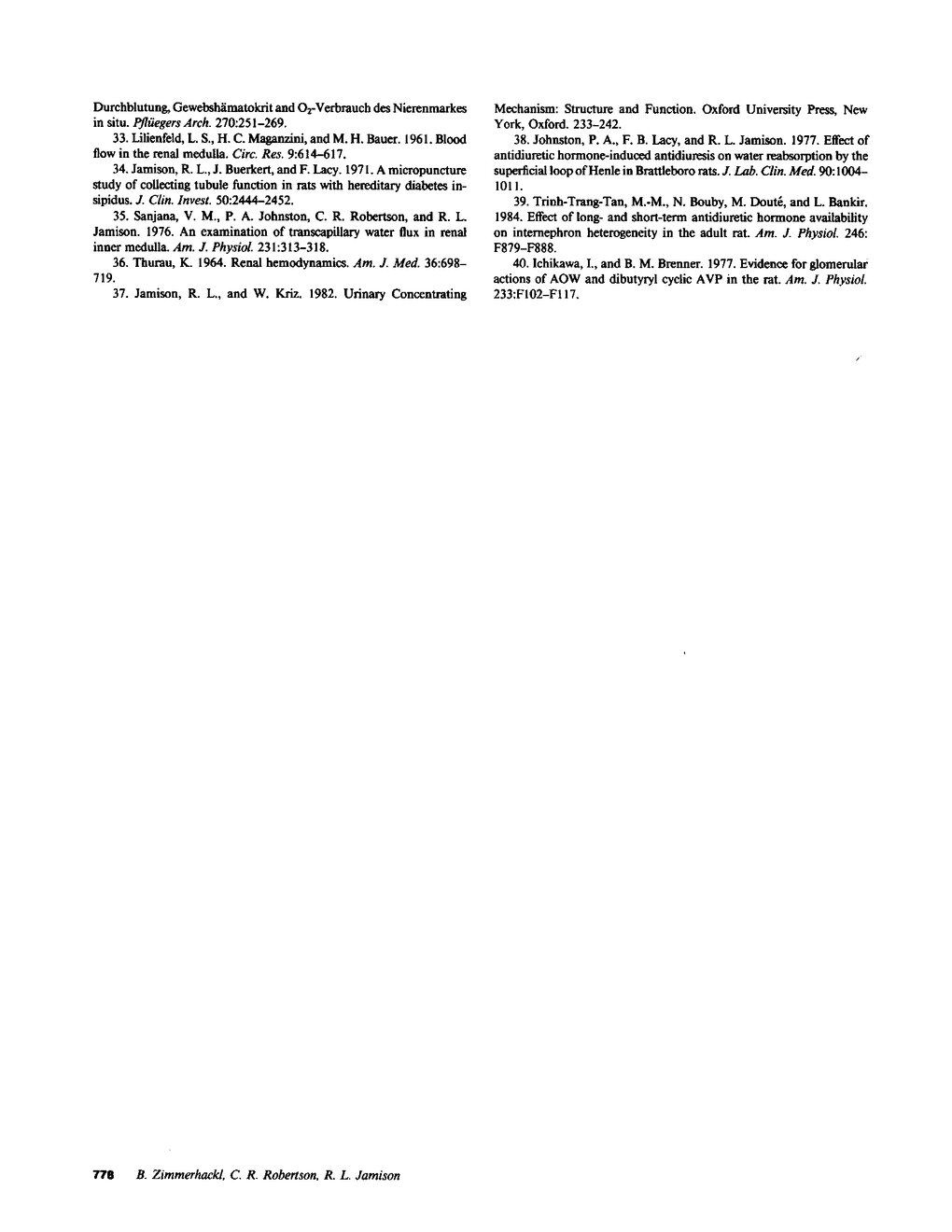 The role of arginine vasopressin (AVP) in the regulation of renal medullary blood flow is uncertain. To determine if AVP has a direct vasoconstrictive action on vasa recta, the effect of AVP on erythrocyte velocity (VRBC), diameter, and blood flow (QVR) in descending vasa recta (DVR) and ascending vasa recta (AVR) was studied in the exposed renal papilla of four groups of chronically water diuretic rats using fluorescence videomicroscopy. There were three periods: control (period 1), experimental (period 2), and recovery (period 3). In periods 1 and 3, all groups received hypotonic saline. In period 2, group I rats (AVP) received AVP (45 ng/h per kg body wt); group II (time) received hypotonic saline alone; group III (AVP plus V1-inhibitor) received AVP plus its vascular antagonist, d(CH2)5Tyr(Me)AVP; and group IV (V1-inhibitor) received the vascular antagonist alone. Another group of rats (group V) was employed to demonstrate that the rise in blood pressure induced by a 3- or 10-ng/kg injection of AVP was virtually abolished by the prior infusion of the V1-inhibitor. The urine of group III as well as group I rats was concentrated (Uosm = 721 +/- 62 H2O vs. 670 +/- 39 mosM/kg), while urine remained dilute in groups II and IV. In period 2, VRBC and QVR in DVR and AVR decreased in group I, did not decrease in group III, and increased in groups II and IV. The vascular antagonist thus completely abolished the AVP-induced decrease in QVR in group III. These findings unequivocally establish that AVP in physiological amounts reduces medullary blood flow, at least in part, by a direct vasoconstrictive action on the medullary microcirculation. They also show that an effect of AVP on medullary blood flow is not necessary for its antidiuretic effect.