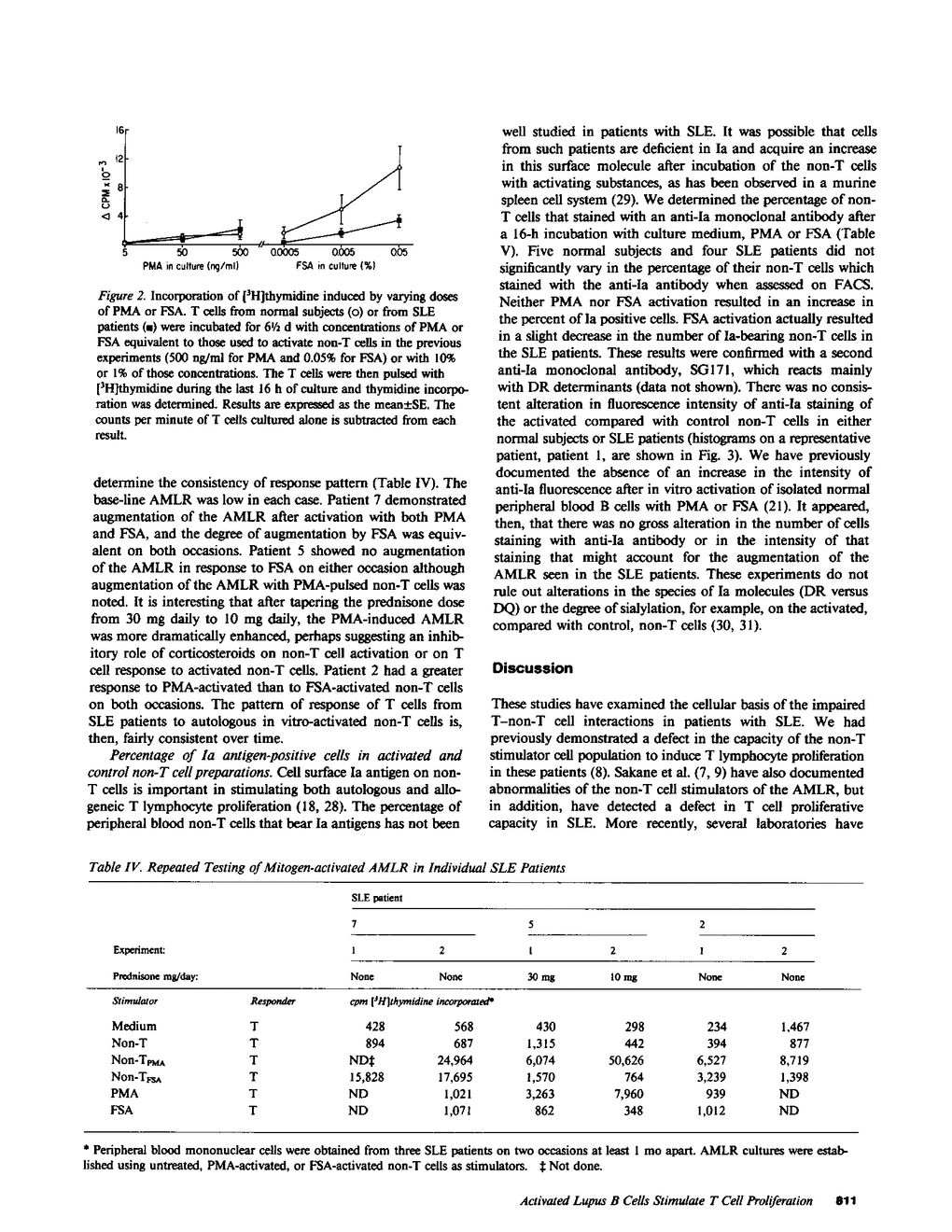 The cellular basis of the impaired autologous mixed leukocyte reaction (AMLR) in patients with systemic lupus erythematosus (SLE) was investigated. Non-T cells from normal subjects and from SLE patients were fractionated into low and high density subpopulations. SLE patients were found to have an increased proportion of low density to high density non-T cells when compared to normal subjects. Although normal low-density non-T cells were highly enriched in AMLR stimulatory capacity, SLE low-density non-T cells induced minimal proliferation by autologous T cells. Brief incubation of SLE non-T cells with phorbol myristate acetate or formalin-treated Staphylococcus aureus resulted in marked augmentation of the capacity of those non-T cells to stimulate an AMLR, although the magnitude of the activated non-T cell-induced AMLR did not achieve that observed in normal subjects. No significant alterations in the expression of Ia molecules on the surface of the non-T cells were detected after in vitro activation. These experiments support the hypothesis that the impaired capacity of SLE T lymphocytes to proliferate in response to autologous non-T cells may in part represent a failure of SLE non-T cells to present an appropriate stimulus for the generation of a T cell response.