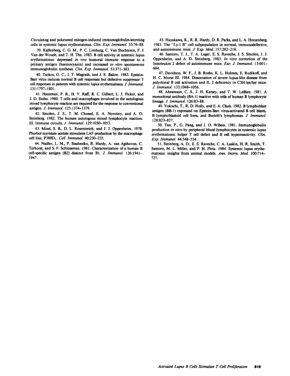 The cellular basis of the impaired autologous mixed leukocyte reaction (AMLR) in patients with systemic lupus erythematosus (SLE) was investigated. Non-T cells from normal subjects and from SLE patients were fractionated into low and high density subpopulations. SLE patients were found to have an increased proportion of low density to high density non-T cells when compared to normal subjects. Although normal low-density non-T cells were highly enriched in AMLR stimulatory capacity, SLE low-density non-T cells induced minimal proliferation by autologous T cells. Brief incubation of SLE non-T cells with phorbol myristate acetate or formalin-treated Staphylococcus aureus resulted in marked augmentation of the capacity of those non-T cells to stimulate an AMLR, although the magnitude of the activated non-T cell-induced AMLR did not achieve that observed in normal subjects. No significant alterations in the expression of Ia molecules on the surface of the non-T cells were detected after in vitro activation. These experiments support the hypothesis that the impaired capacity of SLE T lymphocytes to proliferate in response to autologous non-T cells may in part represent a failure of SLE non-T cells to present an appropriate stimulus for the generation of a T cell response.