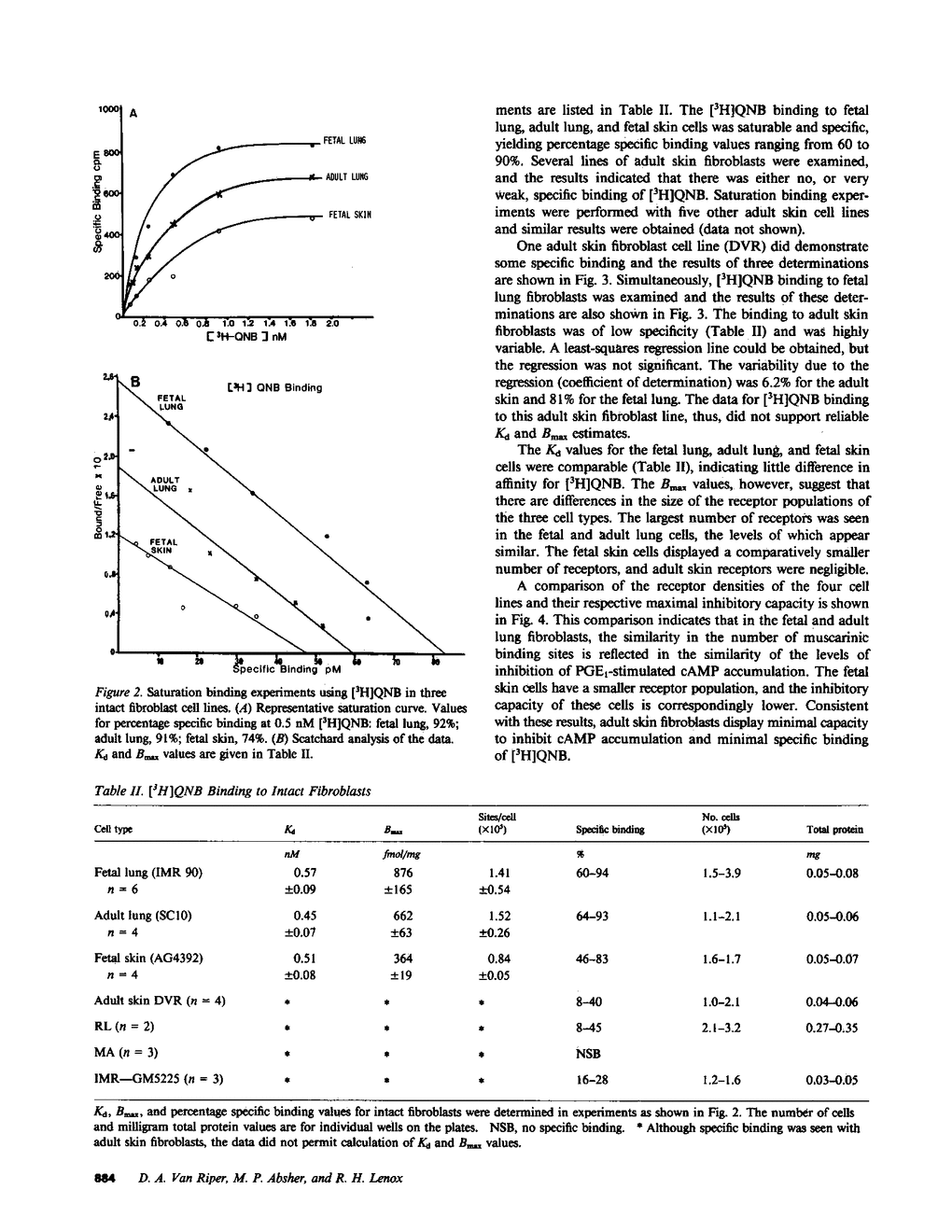 The intact human fibroblast has been used in clinical and basic research studies of receptor-mediated control of cell function, however there is little information about the relationship between muscarinic receptor density and the regulation of cyclic AMP (cAMP) accumulation. We have compared the muscarinic receptor characteristics of both lung and skin intact fibroblasts at fetal and adult stages of development using carbachol-mediated inhibition of cAMP accumulation and the binding of [3H]quinuclidinyl benzilate (QNB). Prostaglandin E1 (PGE1) stimulated cAMP accumulation in all four cell lines, while carbachol inhibited cAMP accumulation only in the fetal lung, adult lung, and to a lesser extent, the fetal skin. Adult skin fibroblasts did not display significant evidence of inhibitory muscarinic receptor activity. [3H]QNB binding was saturable for the fetal and adult lung, and the fetal skin, yielding Kd values of approximately 0.5 nM for these cell lines. Bmax values were 360 fmol/mg for fetal skin, 600 fmol/mg for adult lung, and 876 fmol/mg for the fetal lung. Specific binding of [3H]QNB to adult skin fibroblasts was found to be low and variable. Comparisons of the Bmax values and maximal inhibitory capacities showed that the receptor density paralleled receptor activity in all cell lines. The lack of muscarinic receptor activity in the adult skin fibroblast was confirmed in several different adult skin cell lines, indicating that the adult skin fibroblast may not be an appropriate model for muscarinic receptor activity in clinical investigations.