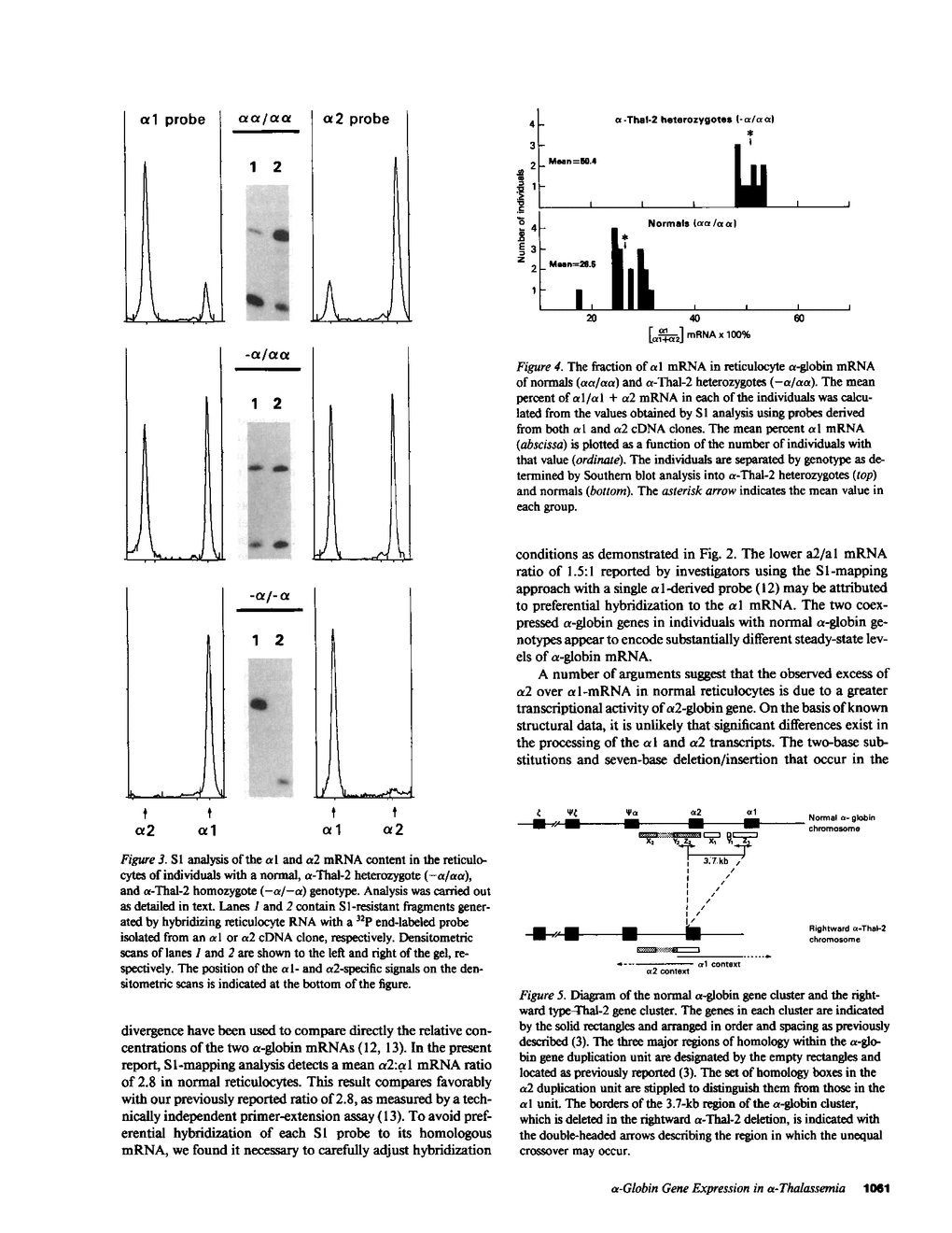 alpha-Globin is encoded by the two adjacent genes, alpha 1 and alpha 2. Although it is clearly established that both alpha-globin genes are expressed, their relative contributions to alpha-globin messenger RNA (mRNA) and protein synthesis are not fully defined. Furthermore, changes that may occur in alpha-globin gene activity secondarily to the loss of function of one or more of these genes (alpha-thalassemia [Thal]) have not been directly investigated. This study further defines the expression of the two human alpha-globin genes by determining the relative levels of alpha 1 and alpha 2 mRNA in the reticulocytes of normal individuals and in individuals heterozygous for the common 3.7-kilobase deletion within the alpha-globin gene cluster that removes the alpha 2-globin gene (the rightward type alpha-Thal-2 deletion). To quantitate accurately the ratio of the two alpha-globin mRNAs, we have modified a previously reported S1 nuclease assay to include the use of 32P end-labeled probes isolated from alpha 1- and alpha 2-globin complementary DNA recombinant plasmids. In individuals with a normal alpha-globin genotype (as determined by Southern blot analysis [alpha alpha/alpha alpha]), alpha 2-globin mRNA is present at an average 2.8-fold excess to alpha 1. In individuals heterozygous for the rightward type alpha-Thal-2 deletion (-alpha/alpha alpha) the alpha 2/alpha 1 mRNA ratio is 1:1. These results suggest that the loss of the alpha 2-globin gene in the alpha-Thal-2 deletion is associated with a 1.8-fold compensatory increase alpha 1-globin gene expression.