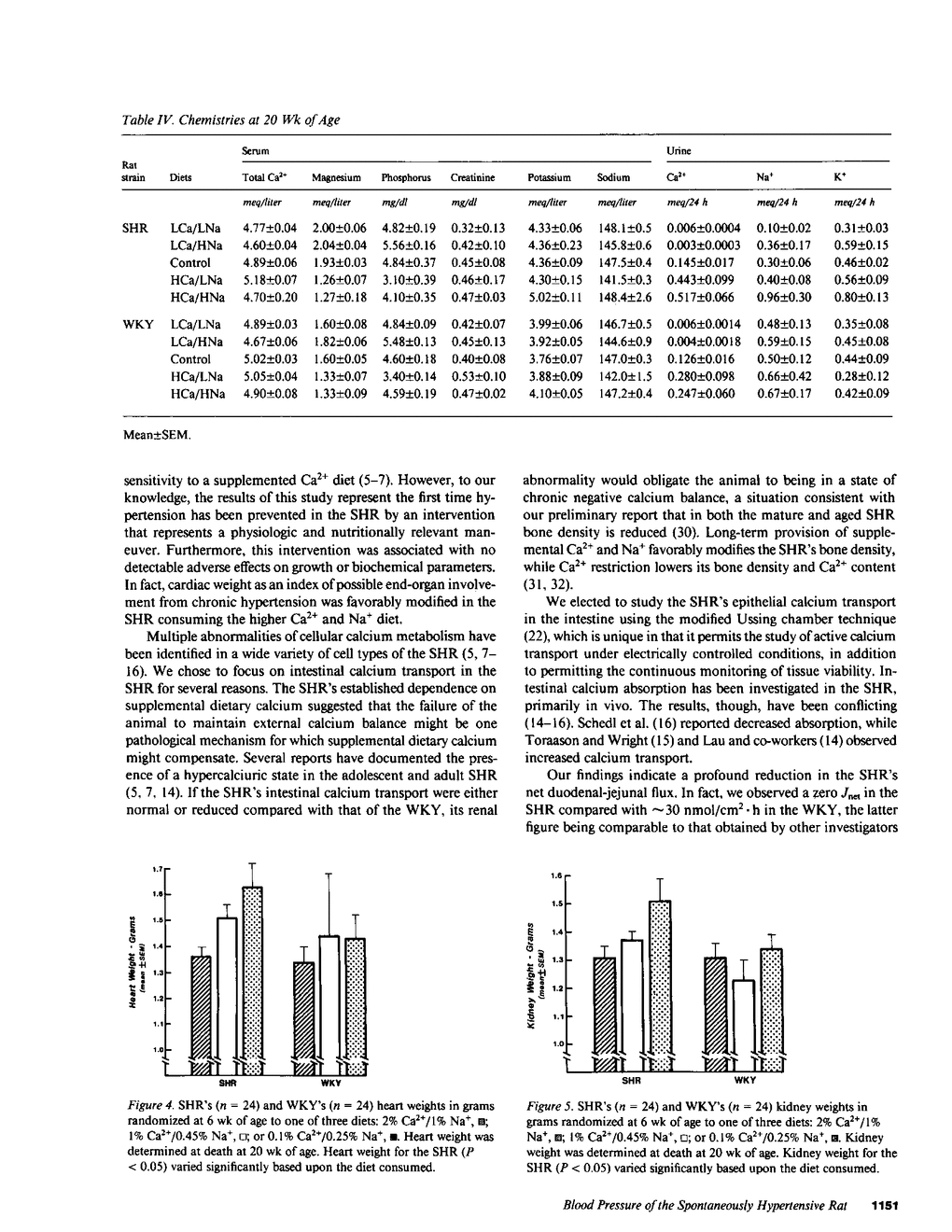 The blood pressure of the spontaneously hypertensive rat (SHR) is influenced by the Ca2+ content of its diet. As the SHR's greater dependence on dietary calcium may reflect a defect in intestinal calcium absorption, we measured in vitro unidirectional Ca2+ flux (J) in the duodenum-jejunum (four segments each) of the SHR (n = 6) and the normotensive Wistar-Kyoto rat (WKY; n = 6) by a modified Ussing apparatus. Because of the known and postulated interactions between Ca2+ and Na+ in both intestinal and vascular tissue, we assessed in vivo the influence of a concurrent manipulation of Na+ intake (three levels: 0.25%, 0.45%, and 1.0%) on the blood pressure development of SHRs (n = 35) and WKYs (n = 35), between 6 and 20 wk of age, exposed to three levels of dietary calcium (0.1, 1.0, and 2%). Net calcium flux (Jnet) (mean +/- SEM) was significantly (P less than 0.01) lower in the SHR (-2.8 +/- 6.3 nmol/cm2 X h) than in the WKY (34.6 +/- 8.8 nmol/cm2 X h). The SHR's decreased Jnet resulted from a significantly (P less than 0.03) lower mucosa-to-serosa flux (Jm-s) in the SHR (41.0 +/- 5.6 nmol/cm2 X h) compared with the Jm-s of the WKY (70.1 +/- 9.1 nmol/cm2 X h). Serosa-to-mucosa flux for calcium did not differ between the SHR (43.8 +/- 6.6 nmol/cm2 X h) and the WKY (35.5 +/- 8.0 nmol/cm2 X h). The SHR's decreased (P less than 0.002) Jm-s was confirmed by additional measurements in SHRs and WKYs. Jm-s was 36.2 +/- 3.7 nmol/cm2 X h in the SHRs (n = 11) and 64.4 +/- 6.7 nmol/cm2 X h in the WKYs (n = 9). The provision of an increased dietary Ca2+ (2% by weight) and increased Na+ (1%) to the SHR prevented the emergence of hypertension (P less than 0.001) (mean +/- SEM systolic blood pressure at 20 wk of age; 135 +/- 5 mmHg for the 2% Ca2+, 1% Na+ SHR vs. 164 +/- 2 mmHg for the control diet SHR). Ca2+ (0.1%) and Na+ (0.25%) restriction accelerated the SHR's hypertension (192 +/- 2 mmHg) (P less than 0.001) and was associated with higher pressures in the WKY (146 +/- 4 mmHg in the restricted WKY vs. 134 +/- 4 mmHg in the control WKY). In a parallel group of 24 SHRs and 24 WKYs fed one of three diets (2% Ca2+/1% Na+; 1% Ca2+/0.45% Na+; or 0.1% Ca2+/0.25% Na+), the heart (P < 0.05) and kidney (P = 0.08) weight of the SHRs varied depending on the diet at 20 wk of age. Low Ca2+ and Na+ intake was associated with increased heart weight (1.6+/-0.9 g) compared with the normal diet for SHR (1.51+/-0.07 g). Increased Ca2+ and Na+ intake was associated with a significantly (P = 0.05) lower heart weight in the SHR (1.37+/-0.03 g) and in the WKY (1.35+/-0.06 g) compared with their normal diet controls. These findings show one mechanism for the SHR's depressor response to supplemental dietary Ca2+ and, in part, explain the sodium dependence of calcium's cardiovascular protective effect.