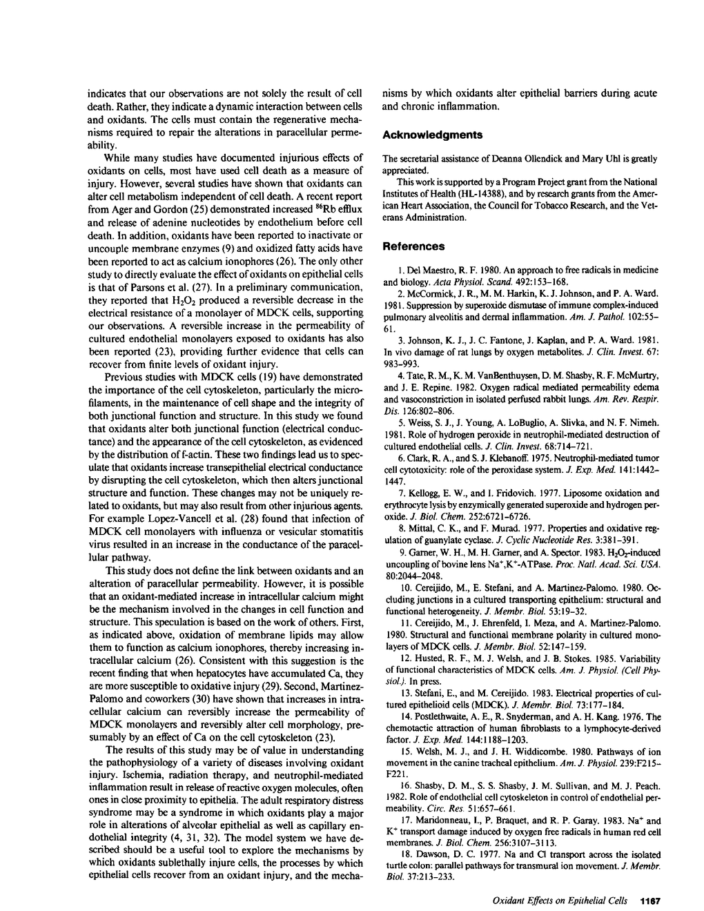 Inflammation of epithelia is an important step in the pathophysiology of a wide variety of diseases. Because reactive oxygen metabolites are important effector molecules of acute inflammation, we examined the effect of oxidants on the barrier function of a cultured epithelium, Madin Darby Canine Kidney cells, by measuring the transepithelial electrical conductance, Gt, of monolayers grown on permeable supports. We found that H2O2, added directly or generated with glucose oxidase, increased Gt. Similar effects were observed with addition of xanthine and xanthine oxidase, a system which enzymatically generates superoxide radical O2-. The oxidant-induced increase in Gt was reversible if the exposure to oxidants was not prolonged (less than 20 min), and if the concentration of H2O2 was less than 5 X 10(-3) M. The increase in Gt suggested that oxidants increase the permeability of the paracellular pathway, a suggestion supported by an oxidant-induced increase in the permeability to 14C-mannitol, which primarily crosses epithelia via the extracellular route. In addition to functional changes in the epithelial monolayer, oxidants changed the cell morphology; after H2O2 exposure, the cells tended to pull apart, most prominently at their basolateral surfaces. These changes were heterogeneous with most areas showing no changes. Some of the morphologic changes could be reversed if the exposure to H2O2 was limited. We also observed a disruption of the normal pattern of the actin-cytoskeleton, particularly in the area of cell to cell junctions, as demonstrated by fluorescent staining of f-actin with rhodamine phallicidin. These functional and structural findings indicate that oxidants increase the permeability of the paracellular pathway in a cultured epithelium. The changes can be reversible, and are accompanied by alterations in organization of the cell cytoskeleton. These studies demonstrate the dynamic nature of the interaction between epithelial cells and oxygen metabolites.