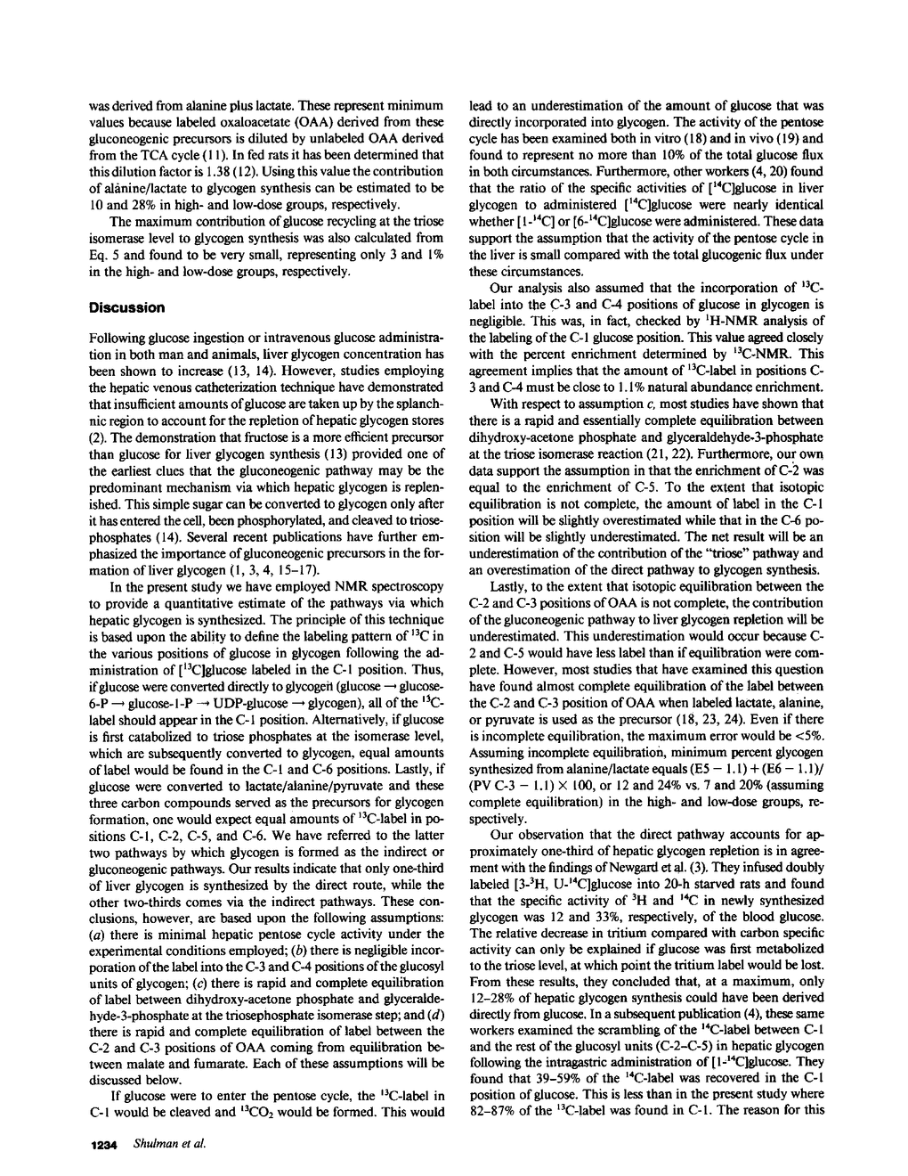 In order to quantitate the pathways by which liver glycogen is repleted, we administered [1-13C]glucose by gavage into awake 24-h fasted rats and examined the labeling pattern of 13C in hepatic glycogen. Two doses of [1-13C]glucose, 1 and 6 mg/g body wt, were given to examine whether differences in the plasma glucose concentration altered the metabolic pathways via which liver glycogen was replenished. After 1 and 3 h (high-dose group) and after 1 and 2 h (low-dose group), the animals were anesthetized and the liver was quickly freeze-clamped. Liver glycogen was extracted and the purified glycogen hydrolyzed to glucose with amyloglucosidase. The distribution of the 13C-label was subsequently determined by 13C-nuclear magnetic resonance spectroscopy. The percent 13C enrichment of the glucosyl units in glycogen was: 15.1 +/- 0.8%(C-1), 1.5 +/- 0.1%(C-2), 1.2 +/- 0.1%(C-3), 1.1 +/- 0.1%(C-4), 1.6 +/- 0.1%(C-5), and 2.2 +/- 0.1%(C-6) for the high-dose study (n = 4, at 3 h); 16.5 +/- 0.5%(C-1), 2.0 +/- 0.1%(C-2), 1.3 +/- 0.1%(C-3), 1.1 +/- 0.1%(C-4), 2.2 +/- 0.1%(C-5), and 2.4 +/- 0.1%(C-6) in the low-dose study (n = 4, at 2 h). The average 13C-enrichment of C-1 glucose in the portal vein was found to be 43 +/- 1 and 40 +/- 2% in the high- and low-dose groups, respectively. Therefore, the amount of glycogen that was synthesized from the direct pathway (i.e., glucose----glucose-6-phosphate----glucose-1-phosphate----UDP-glucose---- glycogen) was calculated to be 31 and 36% in the high- and low-dose groups, respectively. The 13C-enrichments of portal vein lactate and alanine were 14 and 14%, respectively, in the high-dose group and 11 and 8%, respectively, in the low-dose group. From these enrichments, the minimum contribution of these gluconeogenic precursors to glycogen repletion can be calculated to be 7 and 20% in the high- and low-dose groups, respectively. The maximum contribution of glucose recycling at the triose isomerase step to glycogen synthesis (i.e., glucose----triose-phosphates----glycogen) was estimated to be 3 and 1% in the high- and low-dose groups, respectively. In conclusion, our results demonstrate that (a) only one-third of liver glycogen repletion occurs via the direct conversion of glucose to glycogen, and that (b) only a very small amount of glycogen synthesis can be accounted for by the conversion of glucose to triose phosphates and back to glycogen; this suggests that futile cycling between fructose-6-phosphate and fructose-1,6-diphosphate under these conditions is minimal. Our results also show that (c) alanine and lactate account for a minimum of between 7 and 20% of the glycogen synthesized, and that (d) the three pathways through which the labeled flux is measured account for a total of only 50% of the total glycogen synthesized. These results suggest that either there is a sizeable amount of glycogen synthesis via pathway(s) that were not examined in the present experiment or that there is a much greater dilution of labeled alanine/lactate in the oxaloacetate pool than previously appreciated, or some combination of these two explanations.