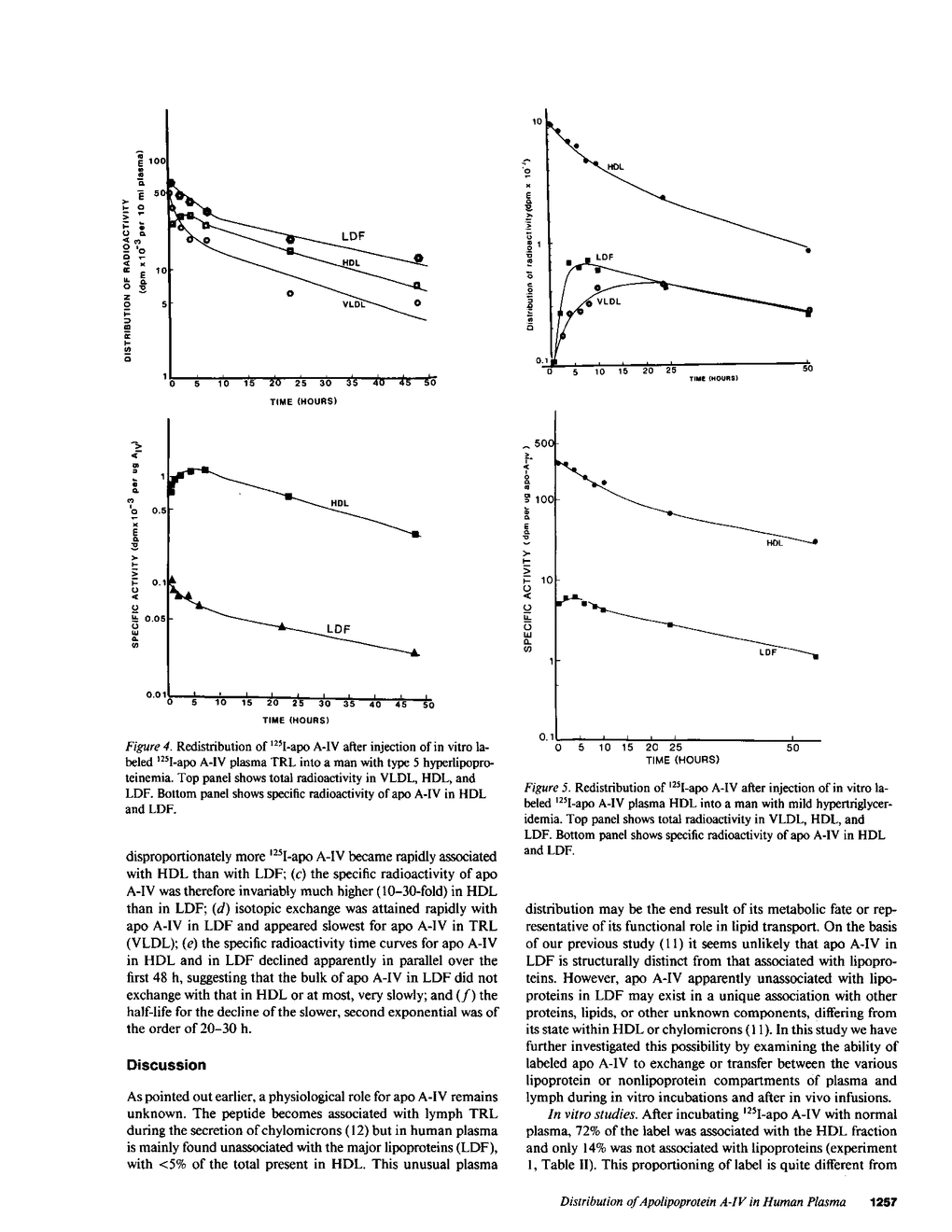To investigate the unique distribution in plasma of apolipoprotein A-IV (apo A-IV) we have determined, in a series of in vitro and in vivo studies, the redistribution among lipoproteins of 125I-apo A-IV. Free 125I-apo A-IV associated predominantly with high density lipoprotein (HDL) (72 +/- 3.5%) in incubations with plasma, and with triglyceride-rich lipoproteins (TRL) (65 +/- 3.0%) in incubations with lymph, rather than with the lipoprotein-deficient fraction (LDF) where greater than 90% of apo A-IV resides. Incubations with 125I-apo A-IV (incorporated within HDL or TRL) also resulted in similar redistributions of label. Specific radioactivities of apo A-IV in HDL and in TRL were of a similar order and 15-fold higher than those in LDF. However, when 125I-apo A-IV in LDF was incubated with plasma, 57 +/- 2.6% of label remained in the LDF, though the specific radioactivity of apo A-IV in HDL was 15-fold higher than in LDF. Thus, apo A-IV apparently exchanges freely between TRL, HDL, and a part of apo A-IV in LDF, but most of apo A-IV in LDF is refractive to free exchange or transfer. In vivo experiments carried out in five subjects, in which 125I-apo A-IV was injected within TRL, HDL, or LDF, were consistent with the in vitro data in showing rapid exchange of label among plasma apo A-IV containing fractions with much higher specific radioactivities in HDL than in LDF (10-30-fold). However, the small fraction of apo A-IV in LDF that did become labeled was removed from plasma in a biexponential fashion and at the same rate as from HDL. Thus, only a small fraction of the bulk of apo A-IV in plasma LDF exchanges freely with apo A-IV in TRL and HDL, suggesting that apo A-IV in LDF exists in at least two pools. This is consistent with our previous findings that apo A-IV in plasma is present in two distinct complexes with lipids and other peptides.