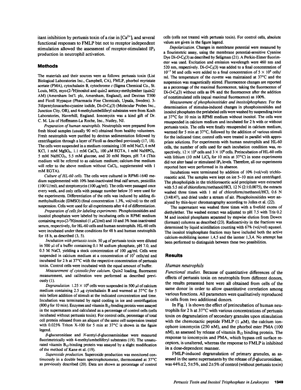 The mechanism of neutrophil activation by the chemotactic peptide formyl-methionyl-leucyl-phenylalanine (FMLP) has been studied by pretreatment of human neutrophils with pertussis toxin. Upon stimulation with FMLP, the cytosolic-free calcium concentration, [Ca2+]i, is increased both by stimulation of calcium influx and mobilization of cellular calcium. We have measured [Ca2+]i as well as the generation of the phospholipid breakdown product inositol trisphosphate (IP3), which is thought to mediate Ca2+ mobilization. As the phosphoinositide pool in human neutrophils is difficult to prelabel with [3H]myoinositol, experiments were also carried out in the cultured human promyelocytic leukemia cell line HL-60 after differentiation with dimethylsulfoxide. Pertussis toxin pretreatment of both cell types inhibited FMLP stimulated membrane depolarization, exocytosis, and superoxide production in a dose-dependent manner. This toxin effect was selective for the receptor agonist, since stimulation of these parameters by two substances bypassing the transduction mechanism, the calcium ionophore ionomycin and the phorbolester phorbol myristate acetate, were unaffected. Rises in [Ca2+]i, as well as generation of IP3 in response to FMLP, were inhibited in parallel; for the inhibition of functional responses, slightly lower toxin concentrations were required. The attentuation of the [Ca2+]i rise was more marked in the absence of extracellular calcium, i.e., when the rise is due only to calcium mobilization. The results provide evidence that phospholipase C stimulation by FMLP resulting in IP3 generation is involved in the signal transduction mechanism. Coupling of FMLP receptor occupancy to phospholipase C activation is sensitive to pertussis toxin, suggesting the involvement of a GTP binding protein (N protein), which has been shown to be a pertussis toxin substrate. The parallel changes in [Ca2+]i and IP3 further support the hypothesis that IP3 is the calcium-mobilizing mediator in FMLP-activated cells.