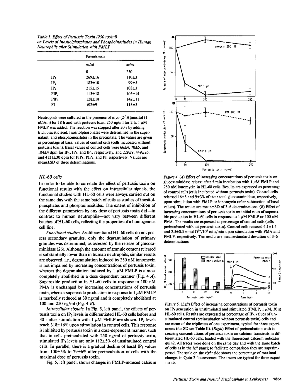 The mechanism of neutrophil activation by the chemotactic peptide formyl-methionyl-leucyl-phenylalanine (FMLP) has been studied by pretreatment of human neutrophils with pertussis toxin. Upon stimulation with FMLP, the cytosolic-free calcium concentration, [Ca2+]i, is increased both by stimulation of calcium influx and mobilization of cellular calcium. We have measured [Ca2+]i as well as the generation of the phospholipid breakdown product inositol trisphosphate (IP3), which is thought to mediate Ca2+ mobilization. As the phosphoinositide pool in human neutrophils is difficult to prelabel with [3H]myoinositol, experiments were also carried out in the cultured human promyelocytic leukemia cell line HL-60 after differentiation with dimethylsulfoxide. Pertussis toxin pretreatment of both cell types inhibited FMLP stimulated membrane depolarization, exocytosis, and superoxide production in a dose-dependent manner. This toxin effect was selective for the receptor agonist, since stimulation of these parameters by two substances bypassing the transduction mechanism, the calcium ionophore ionomycin and the phorbolester phorbol myristate acetate, were unaffected. Rises in [Ca2+]i, as well as generation of IP3 in response to FMLP, were inhibited in parallel; for the inhibition of functional responses, slightly lower toxin concentrations were required. The attentuation of the [Ca2+]i rise was more marked in the absence of extracellular calcium, i.e., when the rise is due only to calcium mobilization. The results provide evidence that phospholipase C stimulation by FMLP resulting in IP3 generation is involved in the signal transduction mechanism. Coupling of FMLP receptor occupancy to phospholipase C activation is sensitive to pertussis toxin, suggesting the involvement of a GTP binding protein (N protein), which has been shown to be a pertussis toxin substrate. The parallel changes in [Ca2+]i and IP3 further support the hypothesis that IP3 is the calcium-mobilizing mediator in FMLP-activated cells.