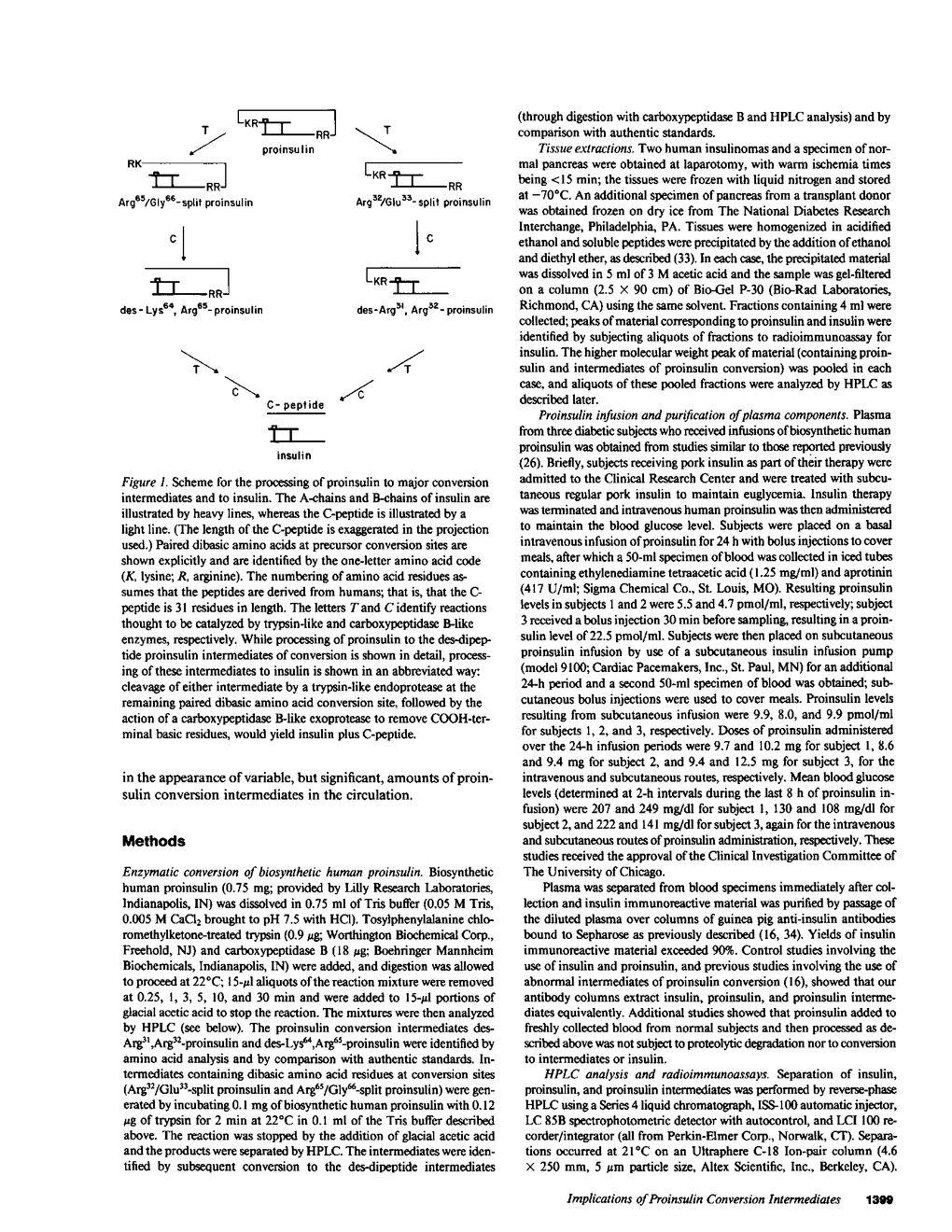 Since a complete map of insulin-related peptides in humans requires consideration of proinsulin, Arg32/Glu33-split proinsulin, Arg65/Gly66-split proinsulin, des-Arg31,Arg32-proinsulin, des-Lys64, Arg65-proinsulin, and insulin, we applied high performance liquid chromatography coupled with radioimmunoassay to investigate the formation of proinsulin conversion intermediates in vitro and in vivo. Kinetic analysis of proinsulin processing by a mixture of trypsin and carboxypeptidase B (to stimulate in vivo processes) revealed (a) a rapid decline in proinsulin concommitant with formation of conversion intermediates, (b) formation of des-Arg31, Arg32-proinsulin and des-Lys64,Arg65-proinsulin in the ratio 3.3:1 at steady state, and (c) complete conversion of the precursor to insulin during extended incubation. Studies on normal human pancreas identified a similar ratio of des-Arg31,Arg32-proinsulin to des-Lys64,Arg65-proinsulin (approximately 3:1), whereas two insulinomas contained sizable amounts of des-Arg31,Arg32-proinsulin, but barely detectable amounts of des-Lys64,Arg65-proinsulin. None of the tissues contained measurable quantities of Arg32/Glu33- or Arg65/Gly66-split proinsulin. Analysis of plasma from three diabetic subjects managed by the intravenous infusion of human proinsulin revealed less than 1% processing of the circulating precursor to conversion intermediates and no processing of the precursor to human insulin. Nevertheless, analysis of plasma from the same subjects managed by the subcutaneous infusion of proinsulin revealed 4-11% processing of the precursor to intermediates that had the properties of des-Arg31,Arg32-proinsulin and Arg65/Gly66-split proinsulin. We conclude that (a) processing of proinsulin to insulin in vivo as in vitro likely occurs by preferential cleavage at the Arg32-Glu33 peptide bond in proinsulin, (b) proinsulin is inefficiently processed in the vascular compartment, and (c) subcutaneous administration of the precursor can result in the formation of conversion intermediates with the potential for contributing to biological activity.