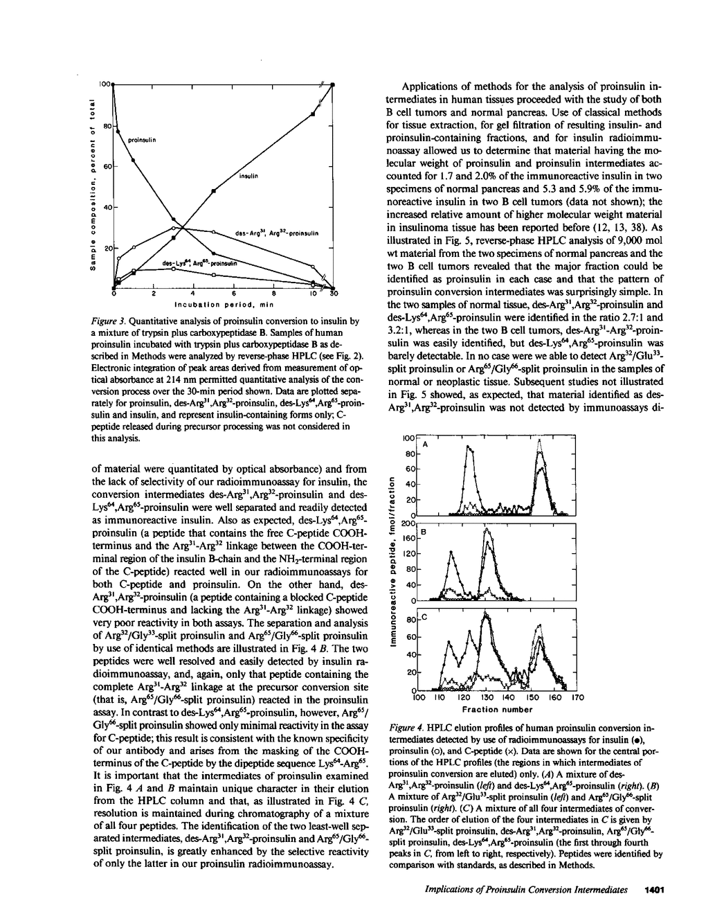 Since a complete map of insulin-related peptides in humans requires consideration of proinsulin, Arg32/Glu33-split proinsulin, Arg65/Gly66-split proinsulin, des-Arg31,Arg32-proinsulin, des-Lys64, Arg65-proinsulin, and insulin, we applied high performance liquid chromatography coupled with radioimmunoassay to investigate the formation of proinsulin conversion intermediates in vitro and in vivo. Kinetic analysis of proinsulin processing by a mixture of trypsin and carboxypeptidase B (to stimulate in vivo processes) revealed (a) a rapid decline in proinsulin concommitant with formation of conversion intermediates, (b) formation of des-Arg31, Arg32-proinsulin and des-Lys64,Arg65-proinsulin in the ratio 3.3:1 at steady state, and (c) complete conversion of the precursor to insulin during extended incubation. Studies on normal human pancreas identified a similar ratio of des-Arg31,Arg32-proinsulin to des-Lys64,Arg65-proinsulin (approximately 3:1), whereas two insulinomas contained sizable amounts of des-Arg31,Arg32-proinsulin, but barely detectable amounts of des-Lys64,Arg65-proinsulin. None of the tissues contained measurable quantities of Arg32/Glu33- or Arg65/Gly66-split proinsulin. Analysis of plasma from three diabetic subjects managed by the intravenous infusion of human proinsulin revealed less than 1% processing of the circulating precursor to conversion intermediates and no processing of the precursor to human insulin. Nevertheless, analysis of plasma from the same subjects managed by the subcutaneous infusion of proinsulin revealed 4-11% processing of the precursor to intermediates that had the properties of des-Arg31,Arg32-proinsulin and Arg65/Gly66-split proinsulin. We conclude that (a) processing of proinsulin to insulin in vivo as in vitro likely occurs by preferential cleavage at the Arg32-Glu33 peptide bond in proinsulin, (b) proinsulin is inefficiently processed in the vascular compartment, and (c) subcutaneous administration of the precursor can result in the formation of conversion intermediates with the potential for contributing to biological activity.