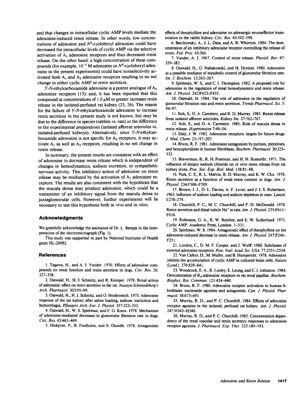This study was designed to examine: (a) the effects of adenosine and its analogues on renin release in the absence of tubules, glomeruli, and macula densa, and (b) whether adenosine may be involved in a macula densa-mediated renin release mechanism. Rabbit afferent arterioles (Af) alone and afferent arterioles with macula densa attached (Af + MD) were microdissected and incubated for two consecutive 30-min periods. Hourly renin release rate from a single arteriole (or an arteriole with macula densa) was calculated and expressed as ng AI X h-1 X Af-1 (or Af + MD-1)/h (where AI is angiotensin I). Basal renin release rate from Af was 0.69 +/- 0.09 ng AI X h-1 X Af-1/h (means +/- SEM, n = 16) and remained stable for 60 min. Basal renin release rate from Af + MD was 0.20 +/- 0.04 ng AI X h-1 X Af + MD-1/h (n = 6), which was significantly lower (P less than 0.0025) than that from Af. When adenosine (0.1 microM) was added to Af, renin release decreased from 0.72 +/- 0.16 to 0.24 +/- 0.04 ng AI X h-1 X Af-1/h (P less than 0.025; n = 9). However, when adenosine was added to Af + MD, no significant change in renin release was observed. N6-cyclohexyl adenosine (an A1 adenosine receptor agonist) at 0.1 microM decreased renin release from Af from 0.69 +/- 0.14 to 0.39 +/- 0.12 ng AI X h-1 X Af-1/h (n = 5, P less than 0.05). However, 5'-N-ethylcarboxamide adenosine (an A2 adenosine receptor agonist) either at 0.1 microM or at 10 microM had no effect. Theophylline, at a concentration (10 microM) that does not block phosphodiesterase but does block adenosine receptors, increased renin release from Af + MD from 0.21 +/- 0.03 to 0.46 +/- 0.08 ng AI X h-1 X Af + MD-1/h (P less than 0.05; n = 8). The results are consistent with the hypotheses that adenosine decreases renin release via the activation of A1 adenosine receptors, and that adenosine may be an inhibitory signal from the macula densa to juxtaglomerular cells.