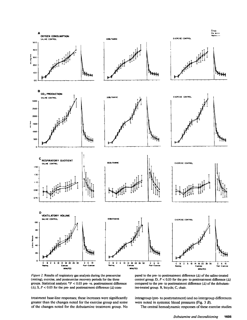 The effects of intermittent infusions of dobutamine were studied in young normal male subjects during a period of bedrest deconditioning to determine whether this synthetic catechol affects physical conditioning processes in humans. 24 volunteers were placed at bedrest and randomized to daily 2-h treatments of saline infusions (control), dobutamine infusions, or maintenance exercise (control). Exercise, hemodynamic, and metabolic studies were performed at base line and at the termination of the 3-wk treatment period. Maximal exercise (duration, oxygen consumption, and workload) fell for the saline group and remained unchanged for the dobutamine and exercise groups. Hemodynamics during exercise were maintained the same as pretreatment base line for the dobutamine and exercise groups, whereas stroke volume and cardiac output dropped and heart rate rose for the saline group. The metabolic profile showed an increased blood lactate response at rest and during submaximal exercise after 3 wk of bedrest for the saline group, and essentially no change for the exercise and the dobutamine groups. Extraction of oxygen across the exercising lower limb rose for the dobutamine group, as did the activity of the skeletal muscle oxidative enzymes, citrate synthetase, and succinate dehydrogenase. In contrast to the exercise control group, the saline and dobutamine groups developed orthostatic hypotension, tachycardia, and accentuation of the renin-aldosterone response over the 3-wk treatment period; for the saline group, this is best explained by the observed fall in blood volume and for the dobutamine group, by the blunting of vascular vasoconstrictive responses. During a period of bedrest deconditioning in humans, infusions of dobutamine maintain many of the physiologic expressions of physical conditioning.