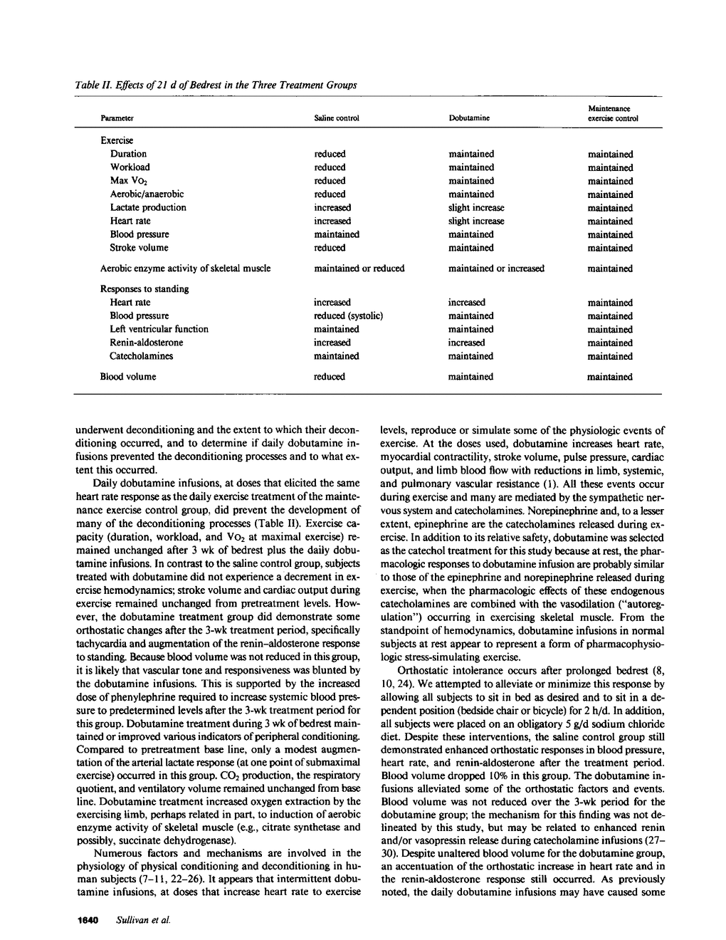 The effects of intermittent infusions of dobutamine were studied in young normal male subjects during a period of bedrest deconditioning to determine whether this synthetic catechol affects physical conditioning processes in humans. 24 volunteers were placed at bedrest and randomized to daily 2-h treatments of saline infusions (control), dobutamine infusions, or maintenance exercise (control). Exercise, hemodynamic, and metabolic studies were performed at base line and at the termination of the 3-wk treatment period. Maximal exercise (duration, oxygen consumption, and workload) fell for the saline group and remained unchanged for the dobutamine and exercise groups. Hemodynamics during exercise were maintained the same as pretreatment base line for the dobutamine and exercise groups, whereas stroke volume and cardiac output dropped and heart rate rose for the saline group. The metabolic profile showed an increased blood lactate response at rest and during submaximal exercise after 3 wk of bedrest for the saline group, and essentially no change for the exercise and the dobutamine groups. Extraction of oxygen across the exercising lower limb rose for the dobutamine group, as did the activity of the skeletal muscle oxidative enzymes, citrate synthetase, and succinate dehydrogenase. In contrast to the exercise control group, the saline and dobutamine groups developed orthostatic hypotension, tachycardia, and accentuation of the renin-aldosterone response over the 3-wk treatment period; for the saline group, this is best explained by the observed fall in blood volume and for the dobutamine group, by the blunting of vascular vasoconstrictive responses. During a period of bedrest deconditioning in humans, infusions of dobutamine maintain many of the physiologic expressions of physical conditioning.
