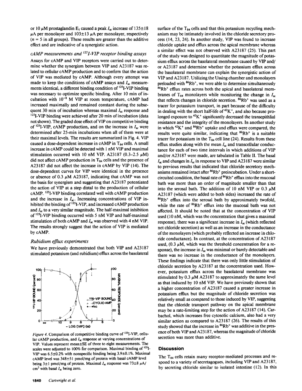 Vasoactive intestinal polypeptide (VIP) and the calcium ionophore A23187 caused dose-dependent changes in the potential difference and the short circuit current (Isc) across confluent T84 cell monolayers mounted in modified Ussing chambers. Both VIP and A23187 stimulated net chloride secretion without altering sodium transport. Net chloride secretion accounted for the increase in Isc. When A23187 was tested in combination with VIP, net chloride secretion was significantly greater than predicted from the calculated sum of their individual responses indicating a synergistic effect. VIP increased cellular cyclic AMP (cAMP) production in a dose-dependent manner, whereas A23187 had no effect on cellular cAMP. We then determined whether VIP and A23187 activated different transport pathways. Earlier studies suggest that VIP activates a basolaterally localized, barium-sensitive potassium channel as well as an apically localized chloride conductance pathway. In this study, stimulation of basolateral membrane potassium efflux by A23187 was documented by preloading the monolayers with 86Rb+. Stimulation of potassium efflux by A23187 was additive to the VIP-stimulated potassium efflux. By itself, 0.3 microM A23187 did not alter transepithelial chloride permeability, and its stimulation of basolateral membrane potassium efflux caused only a relatively small amount of chloride secretion. However, in the presence of an increased transepithelial chloride permeability induced by VIP, the effectiveness of A23187 on chloride secretion was greatly augmented. Our studies suggest that cAMP and calcium each activate basolateral potassium channels, but cAMP also activates an apically localized chloride channel. Synergism results from cooperative interaction of potassium channels and the chloride channel.