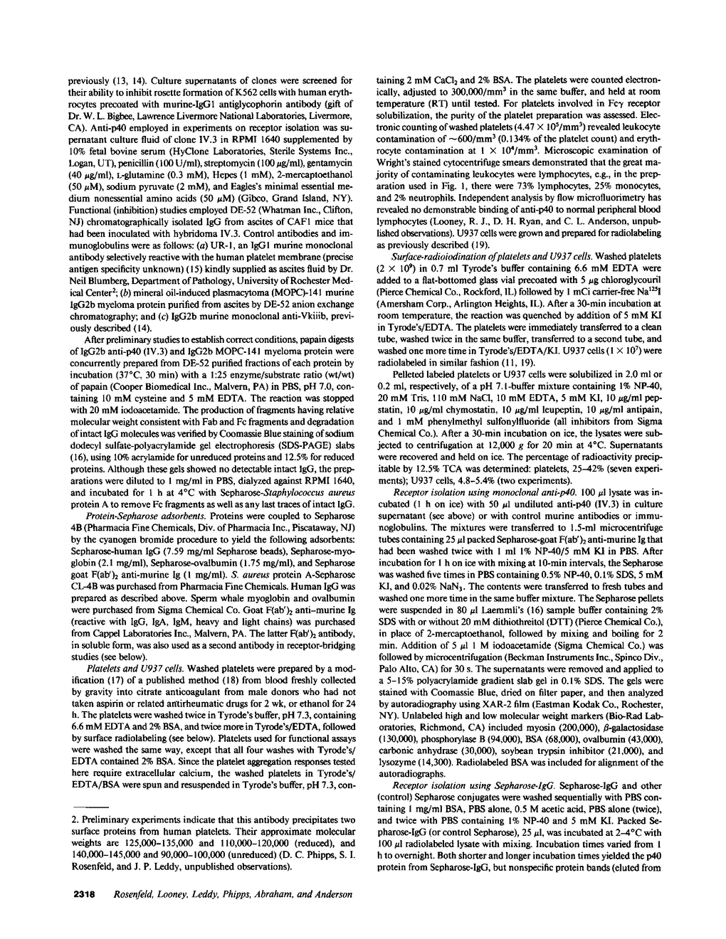 We have recently shown that human monocytes and U937 cells possess two molecular classes of Fc gamma receptor. One, a 72,000-mol-wt sialoglycoprotein, has high affinity for certain subclasses of human and murine monomeric IgG. The other is a 40,000-mol-wt protein (p40) with low affinity for monomeric IgG but with the capacity to bind IgG aggregates or IgG-coated particles. In the present study, a 40,000-mol-wt single chain protein, apparently identical to p40 from U937 cells, was isolated from surface-radioiodinated human platelets by affinity purification using a murine IgG2b monoclonal antibody to p40. This 40,000-mol-wt protein was not seen when control IgG2b or unrelated murine monoclonal antibodies were employed in place of anti-p40. The same 40,000-mol-wt protein was also recovered from an IgG-Sepharose affinity adsorbent, but not from ovalbumin-or myoglobin-Sepharose. The 72,000-mol-wt Fc gamma receptor of monocytes was not identified on platelets. Monoclonal anti-p40 and Fab fragments derived from this antibody blocked platelet aggregation by heat-aggregated human IgG, whereas a control murine IgG2b protein had little or no inhibitory effect at 500-1,000-fold higher concentrations. A murine IgG1 monoclonal antibody, reactive with an unrelated platelet-specific membrane antigen, did not inhibit platelet responses to aggregated IgG. Anti-p40 did not affect platelet aggregation by thrombin, collagen, or fibrinogen plus ADP. Although anti-p40 did not directly aggregate platelets in the concentrations employed, cross-linking with F(ab')2 goat anti-murine Ig induced apyrase-sensitive aggregation of anti-p40-treated platelets. This indicates that p40 possesses transmembrane linkage for platelet activation and secretion. These observations strongly suggest that this newly recognized 40,000-mol-wt platelet membrane protein serves as an Fc gamma receptor.