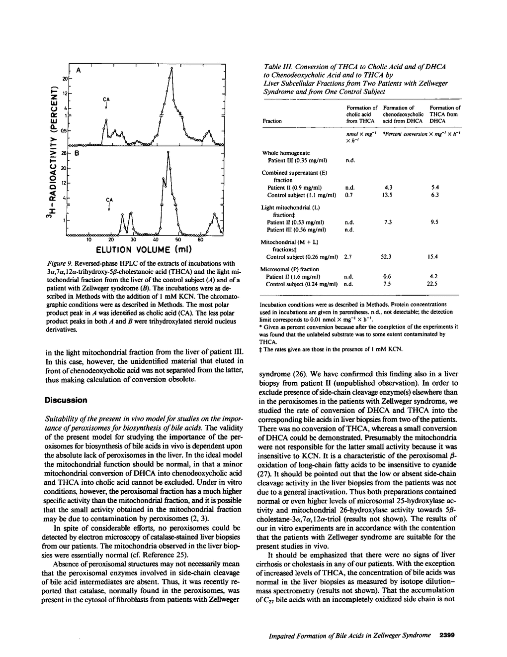 The last step in bile acid formation involves conversion of 3 alpha,7 alpha,12 alpha-trihydroxy-5 beta-cholestanoic acid (THCA) into cholic acid and 3 alpha,7 alpha-dihydroxy-5 beta-cholestanoic acid (DHCA) into chenodeoxycholic acid. The peroxisomal fraction of rat and human liver has the highest capacity to catalyze these reactions. Infants with Zellweger syndrome lack liver peroxisomes, and accumulate 5 beta-cholestanoic acids in bile and serum. We recently showed that such an infant had reduced capacity to convert a cholic acid precursor, 5 beta-cholestane-3 alpha,7 alpha,12 alpha-triol into cholic acid. 7 alpha-Hydroxy-4-cholesten-3-one is a common precursor for both cholic acid and chenodeoxycholic acid. Intravenous administration of [3H]7 alpha-hydroxy-4-cholesten-3-one to an infant with Zellweger syndrome led to a rapid incorporation of 3H into biliary THCA but only 10% of 3H was incorporated into cholic acid after 48 h. The incorporation of 3H into DHCA was only 25% of that into THCA and the incorporation into chenodeoxycholic acid approximately 50% of that in cholic acid. The conversion of intravenously administered [3H]THCA into cholic acid in another infant with Zellweger syndrome was only 7%. There was a slow conversion of THCA into 3 alpha,7 alpha,12 alpha-trihydroxy-5 beta-C29-dicarboxylic acid. The pool size of both cholic- and chenodeoxycholic acid was markedly reduced. Preparations of liver from two patients with Zellweger syndrome had no capacity to catalyze conversion of THCA into cholic acid. There was, however, a small conversion of DHCA into chenodeoxycholic acid and into THCA. It is concluded that liver peroxisomes are important both for the conversion of THCA into cholic acid and DHCA into chenodeoxycholic acid.