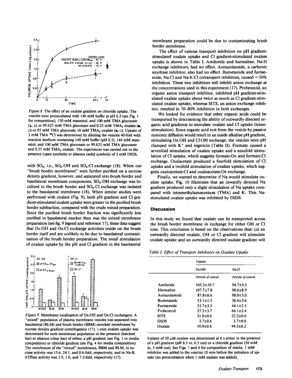 This study demonstrates the presence of oxalate transporters on the brush border membrane of rabbit ileum. We found that an inside alkaline (pH = 8.5 inside, 6.5 outside) pH gradient stimulated [14C]oxalate uptake 10-fold at 1 min with a fourfold accumulation above equilibrated uptake at 5 min. 1 mM 4,4'-diisothiocyanostilbene-2,2'-disulfonate (disodium salt; DIDS) profoundly inhibited the pH-gradient stimulated oxalate uptake. Using an inwardly directed K+ gradient and valinomycin, we found no evidence for potential sensitive oxalate uptake. In contrast to Cl:HCO3 exchange, HCO3 did not stimulate oxalate uptake more than was seen with a pH gradient in the absence of HCO3. An outwardly directed Cl gradient (50 mM inside, 5 mM outside) stimulated oxalate uptake 10-fold at 1 min with a fivefold accumulation above equilibrated uptake. Cl-stimulated oxalate uptake was largely inhibited by DIDS. Addition of K+ and nigericin only slightly decreased the Cl gradient-stimulated oxalate uptake, which indicates that this stimulation was not primarily due to the Cl gradient generating an inside alkaline pH gradient via Cl:OH exchange. Further, an outwardly directed oxalate gradient stimulated 36Cl uptake. These results suggested that both oxalate:OH and oxalate:Cl exchange occur on the brush border membrane. To determine if one or both of these exchanges were on contaminating basolateral membrane, the vesicle preparation was further fractionated into a brush border and basolateral component using sucrose density gradient centrifugation. Both exchangers localized to the brush border component. A number of organic anions were examined (outwardly directed gradient) to determine if they could stimulate oxalate and Cl uptake. Only formate and oxaloacetate were found to stimulate oxalate and Cl uptake. An inwardly directed Na gradient only slightly stimulated oxalate uptake, which was inhibited by DIDS.