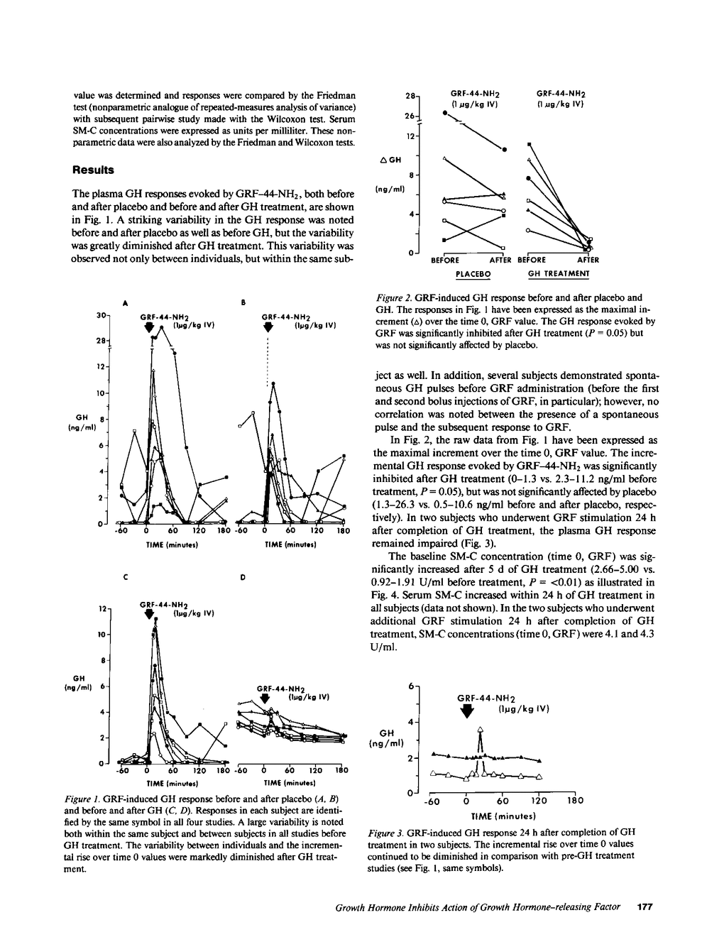 Previous studies from this laboratory and by others in rats, monkeys, and humans support the concept that growth hormone (GH) can regulate its own secretion through an autofeedback mechanism. With the availability of human growth hormone-releasing factor (GRF), the possible existence of such a mechanism was reexplored by examining the effect of exogenous GH on the GH response induced by GRF-44-NH2 in six normal men (mean age, 32.4 yr). In all subjects the plasma GH response evoked by GRF-44-NH2 (1 microgram/kg i.v. bolus) was studied before and after 5 d of placebo (1 ml normal saline i.m. every 12 h), and then before and 12 h after 5 d of biosynthetic methionyl human GH (5 U i.m. every 12 h). The GH response to GRF (maximal increment over time 0 value) was significantly inhibited after GH treatment (0-1.3 vs. 2.3-11.2 ng/ml before treatment, P = 0.05), but was not significantly affected by placebo. This impaired pituitary response to GRF persisted for at least 24 h following exogenous GH treatment in two subjects who underwent further study. Serum somatomedin-C concentrations were significantly increased after 5 d of GH treatment (2.66-5.00 vs. 0.92-1.91 U/ml before treatment, P = less than 0.01). The impaired pituitary response to GRF may be mediated indirectly through somatomedin, somatostatin, by a direct effect of GH on the pituitary somatotropes, or by all of these mechanisms. These data suggest that after GH treatment, the blunted GH response to synthetic GRF is not solely a consequence of the inhibition of hypothalamic GRF secretion.