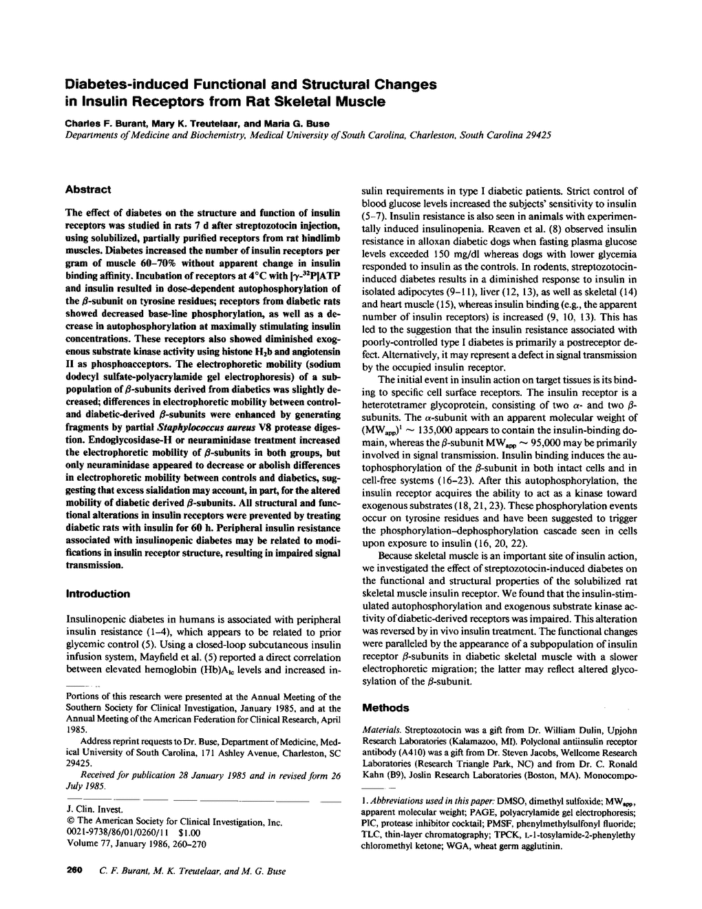 The effect of diabetes on the structure and function of insulin receptors was studied in rats 7 d after streptozotocin injection, using solubilized, partially purified receptors from rat hindlimb muscles. Diabetes increased the number of insulin receptors per gram of muscle 60-70% without apparent change in insulin binding affinity. Incubation of receptors at 4 degrees C with [gamma-32P]ATP and insulin resulted in dose-dependent autophosphorylation of the beta-subunit on tyrosine residues; receptors from diabetic rats showed decreased base-line phosphorylation, as well as a decrease in autophosphorylation at maximally stimulating insulin concentrations. These receptors also showed diminished exogenous substrate kinase activity using histone H2b and angiotensin II as phosphoacceptors. The electrophoretic mobility (sodium dodecyl sulfate-polyacrylamide gel electrophoresis) of a subpopulation of beta-subunits derived from diabetics was slightly decreased; differences in electrophoretic mobility between control- and diabetic-derived beta-subunits were enhanced by generating fragments by partial Staphylococcus aureus V8 protease digestion. Endoglycosidase-H or neuraminidase treatment increased the electrophoretic mobility of beta-subunits in both groups, but only neuraminidase appeared to decrease or abolish differences in electrophoretic mobility between controls and diabetics, suggesting that excess sialilation may account, in part, for the altered mobility of diabetic derived beta-subunits. All structural and functional alterations in insulin receptors were prevented by treating diabetic rats with insulin for 60 h. Peripheral insulin resistance associated with insulinopenic diabetes may be related to modifications in insulin receptor structure, resulting in impaired signal transmission.